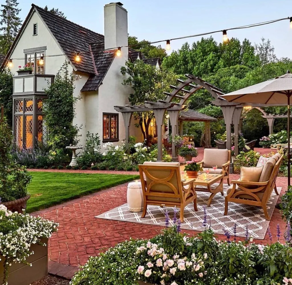 Traditional is not dead! This outdoor courtyard and garden have us wishing we could be teleported right about now. Imagine sipping martinis, watching the bees pollinate the wide variety of flowers all while the birds whistle a tune when taking their morning bath. Yes please!