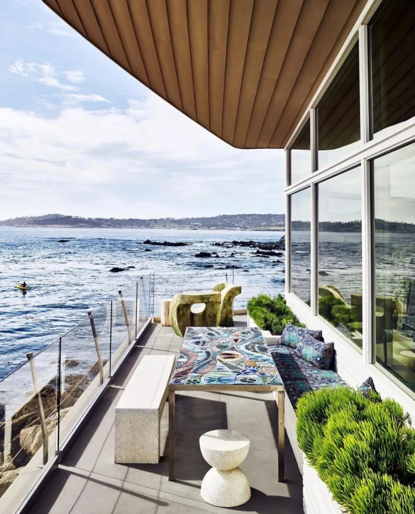 We love the simple design yet artistic design of this waterfront patio. Low profile furniture keeps the beautiful ocean view as the pièce de résistance and adds color and intention to an otherwise monotone space.