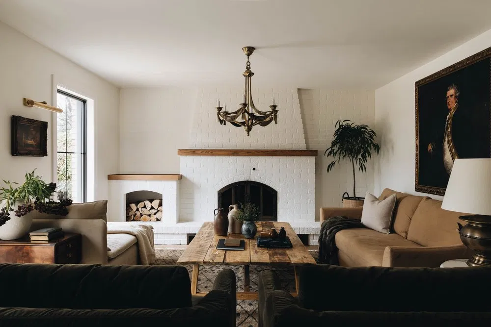 We’ll always love an old brick fireplace that’s been revived by white paint and topped with a rustic wood mantel for warmth and character. This seductive living room features a blend of natural materials, muted textured furniture and historical art, creating a cozy seating area with a hint of rural elegance.