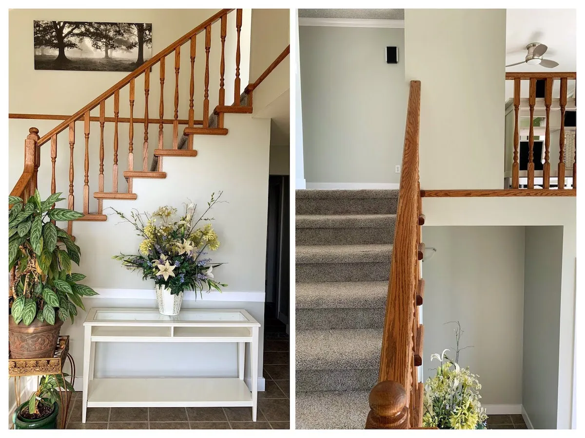 The main staircase leads you from the front door to the main floor. The old oak styling and plush carpet were ready to be retired.