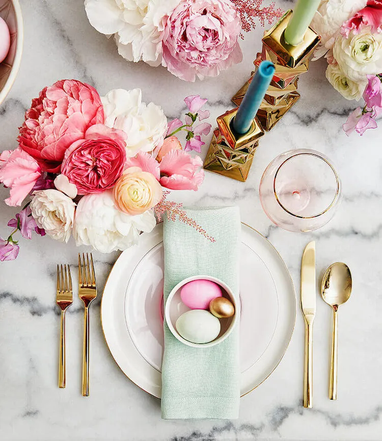 Set the table together. What a contrast from December tables: this one is more fun, floral, and filled with candy colours. Gather greenery, eggs, spring flowers, feathers, linens, and get creative. The kids can help make many of these table settings —with your supervision, of course.