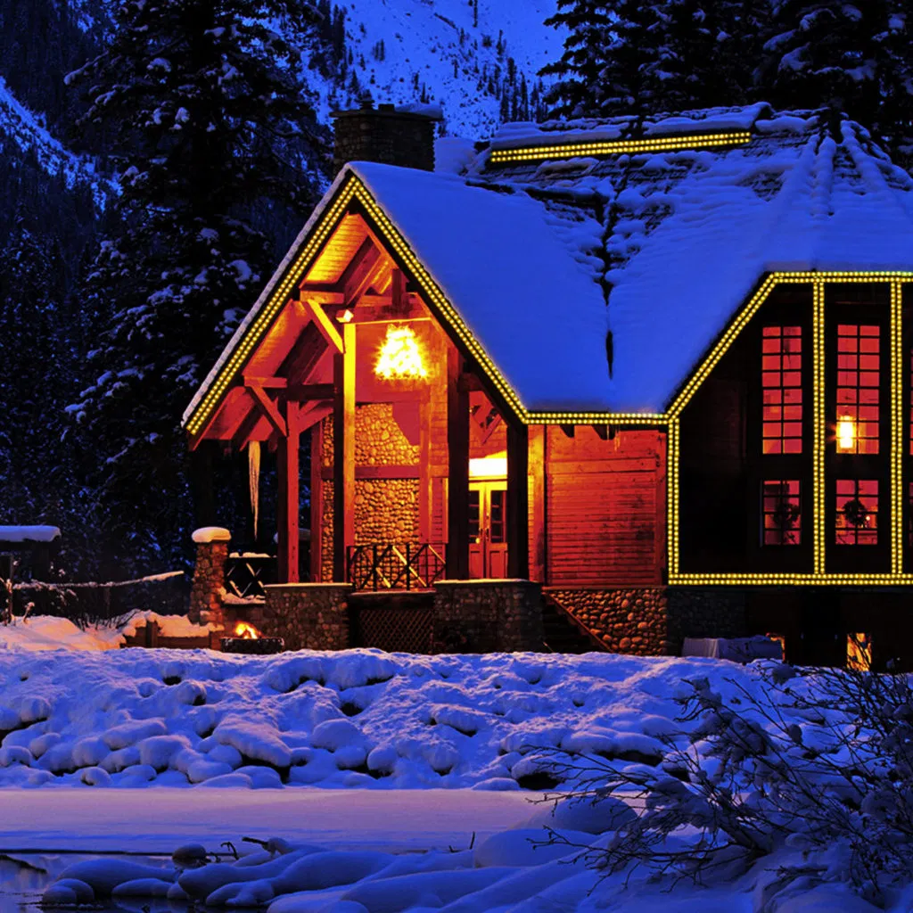 This might be one of our favourite holiday lighting ideas for the home this season. Being in the PNW (Pacific North West), we’re surrounded by lush forests to inspire us. We love how this simple, idea can make your outdoor space feel rustic, yet elegant. Imagine this along your front porch or draping your back deck. This idea may not be for an entire house but rather a small space where people gather.