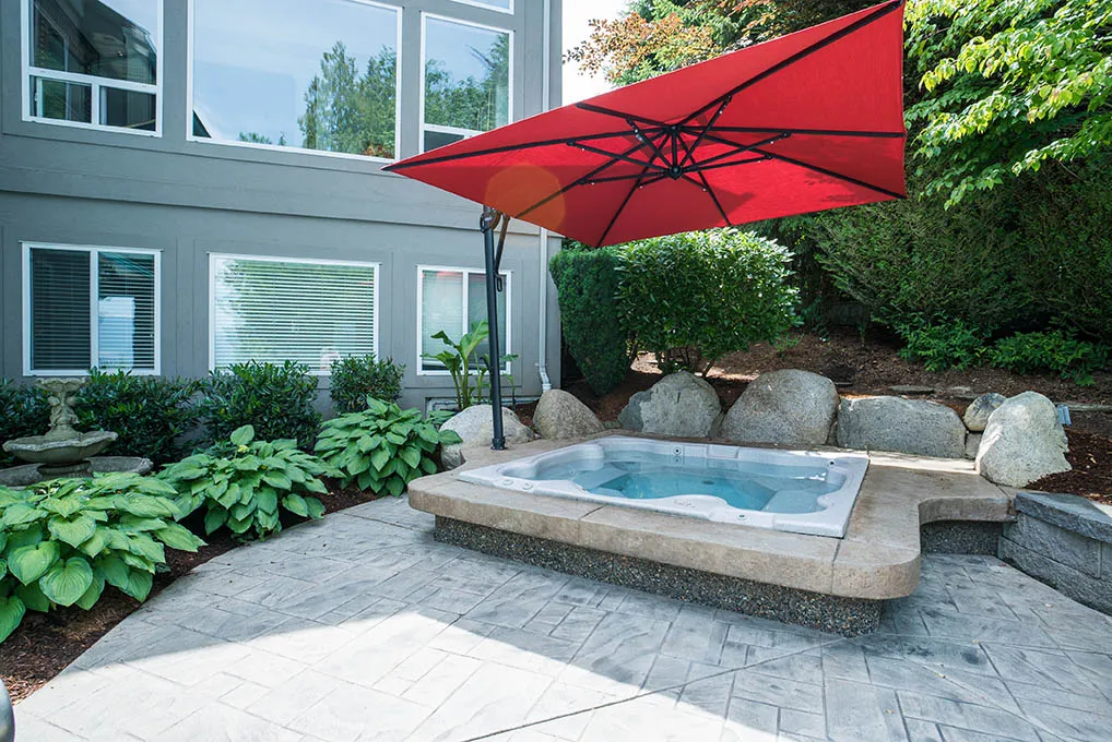 These combine the best of both worlds: a portable hot tub set into the ground and finished with a permanent surround. In our client’s Fraser Heights exterior renovation, the concrete surround reflects the back yard’s hardscaping, and provides a generous smooth edge for seating and drinks.