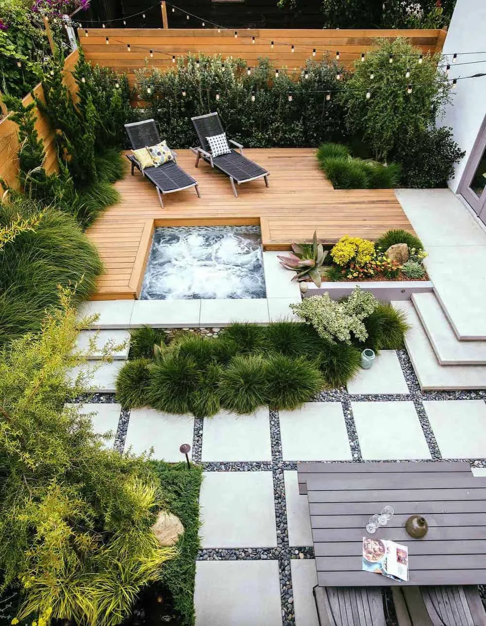 Small yard situation? This is where professional landscape design and construction comes in, helping you maximize a tighter space to its full potential! This built-in spa is lined with blue mosaic tile and surrounded by a Redwood deck.