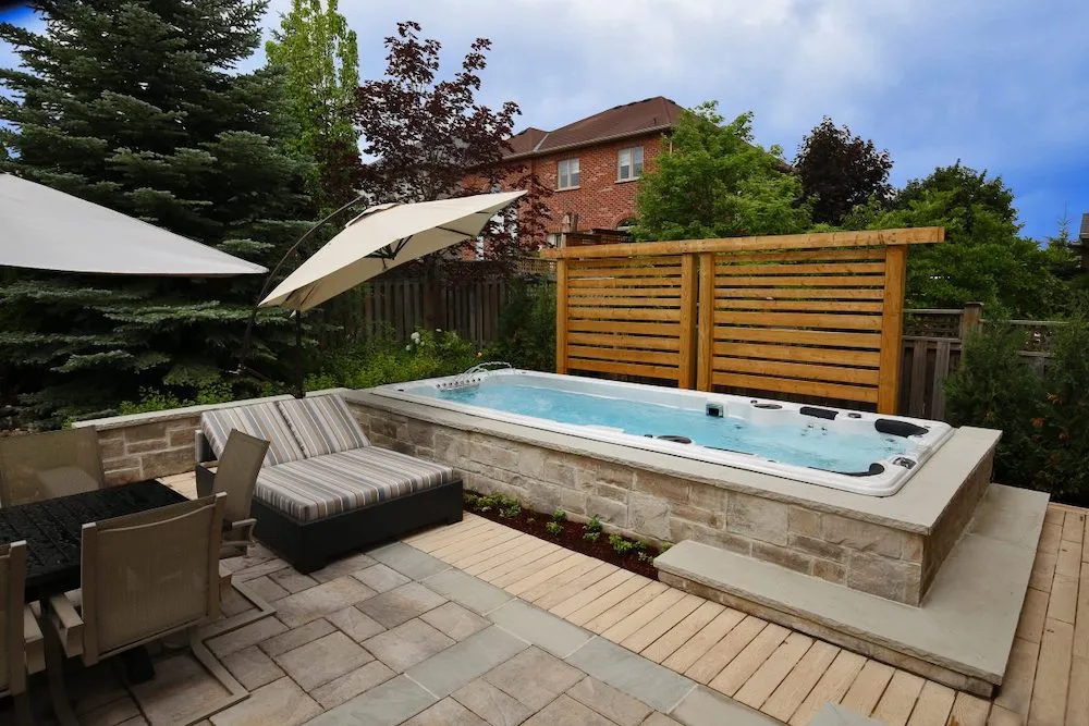 The second option is a deep-water plunge pool, which looks like a mini swimming pool (or larger hot tub). Some plunge pools are used for cold water therapy, some for aqua exercise, and some do double-duty as a spa. On hot days a plunge pool is a more sophisticated option than taking over the kiddie pool from the kids.