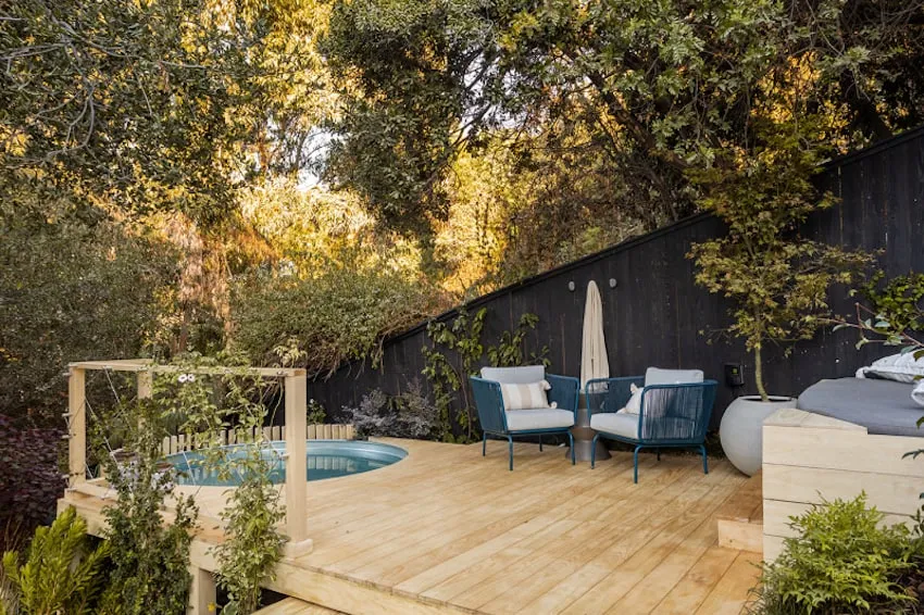 Shanti Wijaya, founder of a boutique real estate & renovation company in LA, made her backyard more COVID-friendly with a stock tank seamlessly inset in the deck, a perfect spot to dangle legs while taking in the forested backdrop.