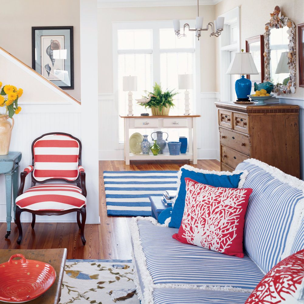 We love the subtlety of these red and white accents complimenting the overall blue theme of this space. What’s great is that the cushions can be used seasonally and stored throughout the rest of the year. The chair can fit into a variety of spaces and be used as you see fit! This space is patriotic without being too over the top.