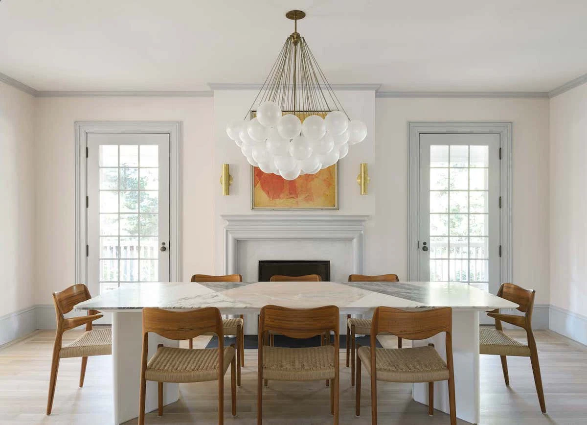 Arguably one of the simplest, highest-impact ways to update a room is lighting. Especially now, when bold lighting statements are abundant and available in a wide range of materials, styles, and prices. Replacing an outworn light fixture with something special – new or vintage – sheds a whole new light on a room. Imagine the dining room above without that spectacular bubble chandelier and simple brass wall sconces enhancing the painting?