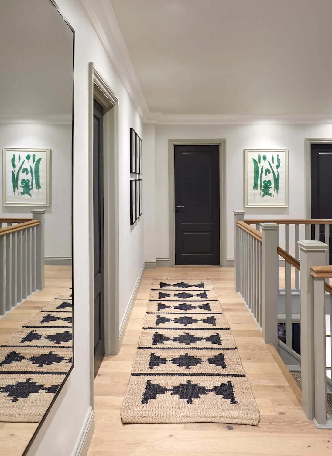 Thinking beyond walls, apply fresh paint to doors, trim, well-worn floors or dated-looking furniture. In the image above, contrasting doors and trim – along with the jute runner and contemporary art – freshen up an older home’s hallway.