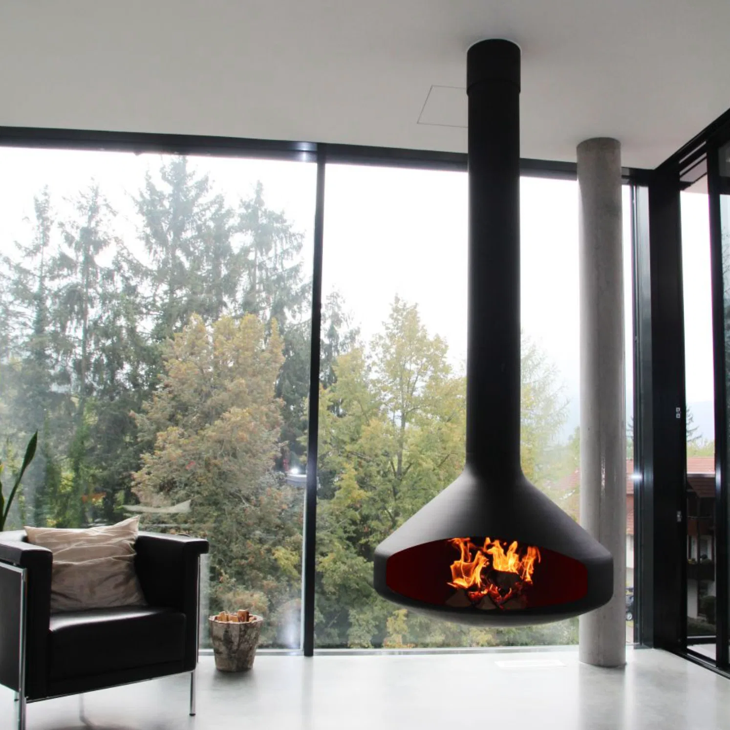 We’re not going to sidestep the fact that the choices are overwhelming. So to tighten this topic up, we’ll focus on standard interior wall-mounted fireplaces and not freestanding, hanging (like the retro-cool one that we just had to show you below), or exterior ones.