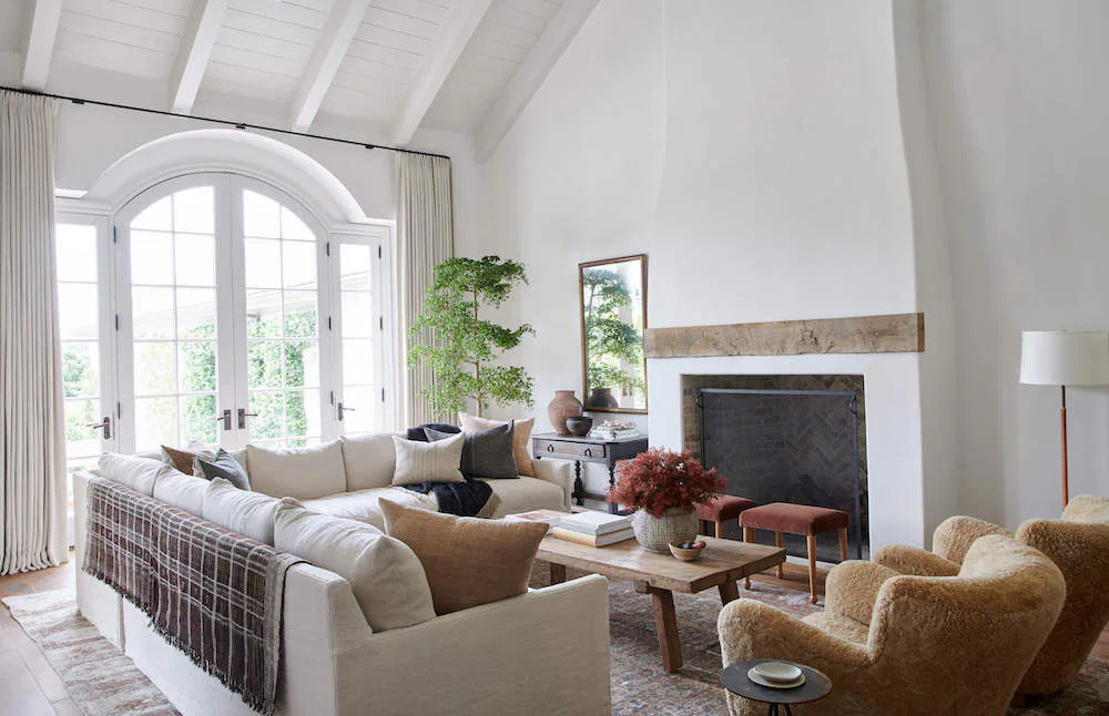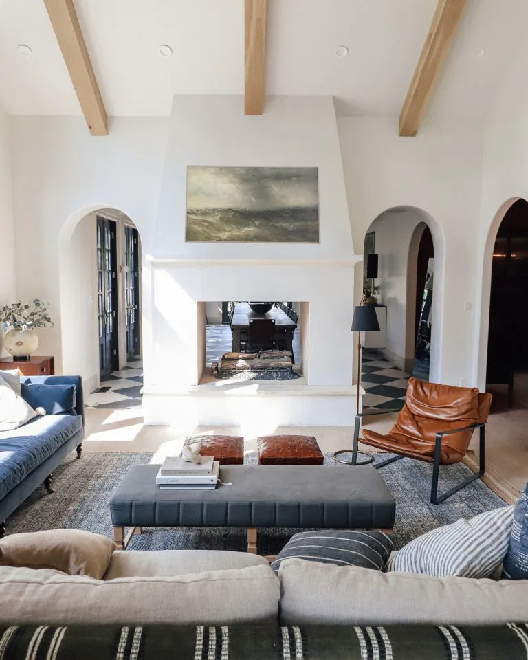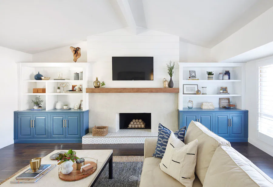 Although she considered tearing down the original river stone fireplace in her Mountain House, designer Emily Henderson opted to refurbish it by hiring a “plaster dude” to plaster around the rocks, smoothing out the look, and painting it a lighter colour. After adding a different wood mantel, removing the raised hearth and brassy firebox door, she has a gorgeous ‘new’ fireplace.
