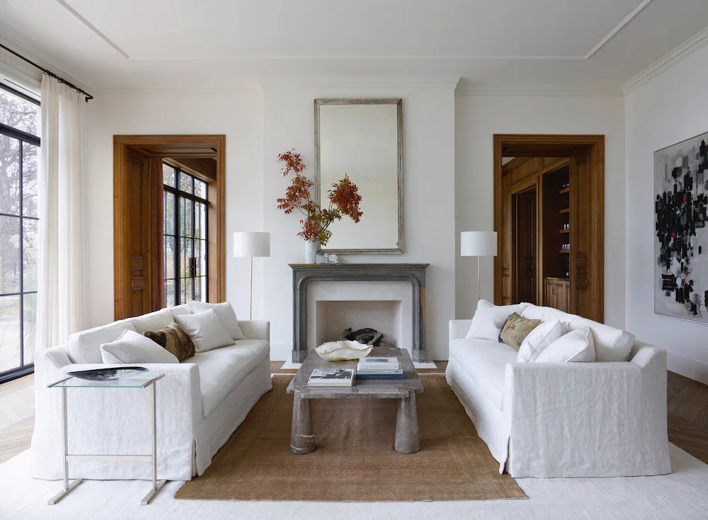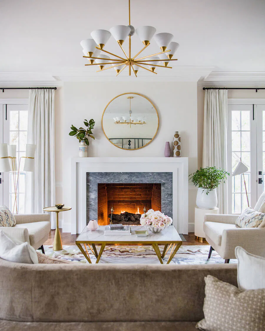 We think this fireplace by Kara Mann is simply beautiful – it has a traditional-looking stone mantel and legs, but the white-tiled firebox and trim have a contemporary vibe.