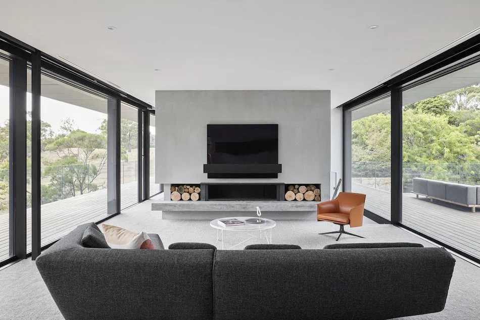 These styles are simplistic and – surprise – minimalistic in their approach. Without the detail work, other design elements such as the choice of material, shape, scale, and/or positioning on the wall make these fireplaces designs glow. The example above shows a ‘ribbon’ firebox.