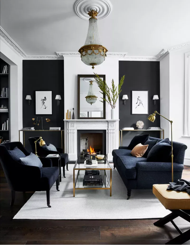 This industrial-inspired fireplace above features a black metal sheet surround and black brick with a honed black granite hearth, making a dramatic effect in the otherwise light-coloured room.