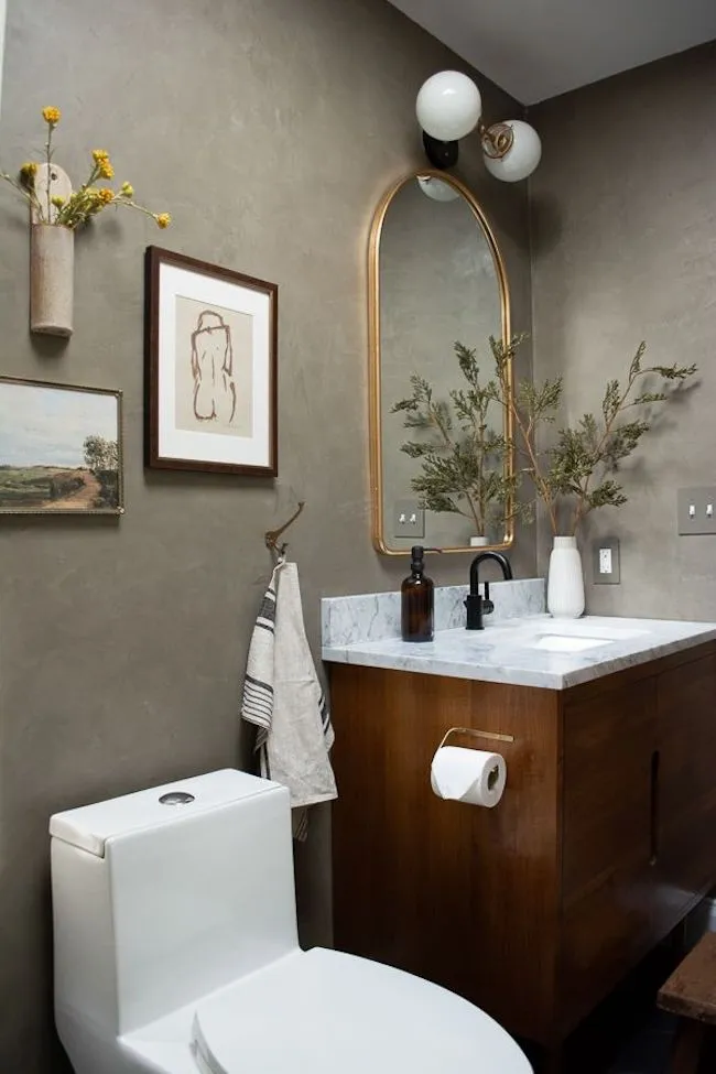 - A dominant metal – bronze hardware and light fixture (possibly also the mirror in the corner)