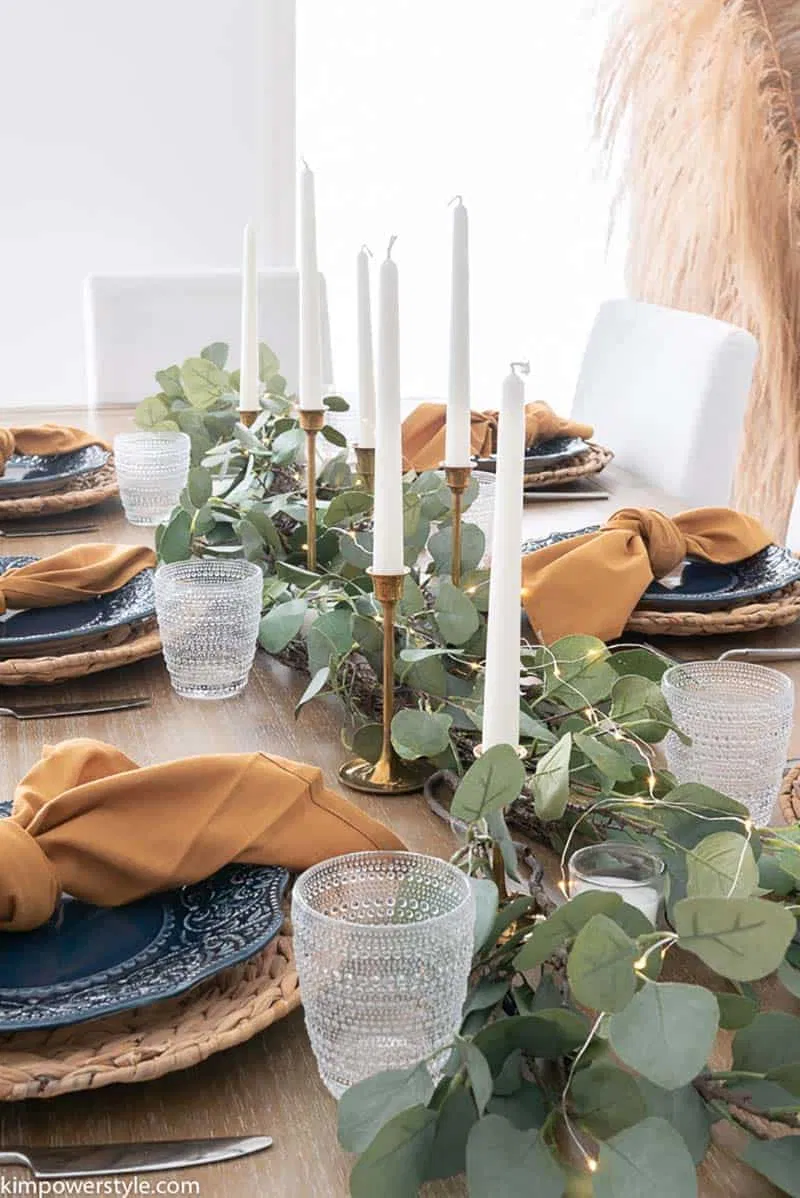 An easy fall decor idea includes Eucalyptus interwoven with fairy lights or apples, plus candlesticks.
