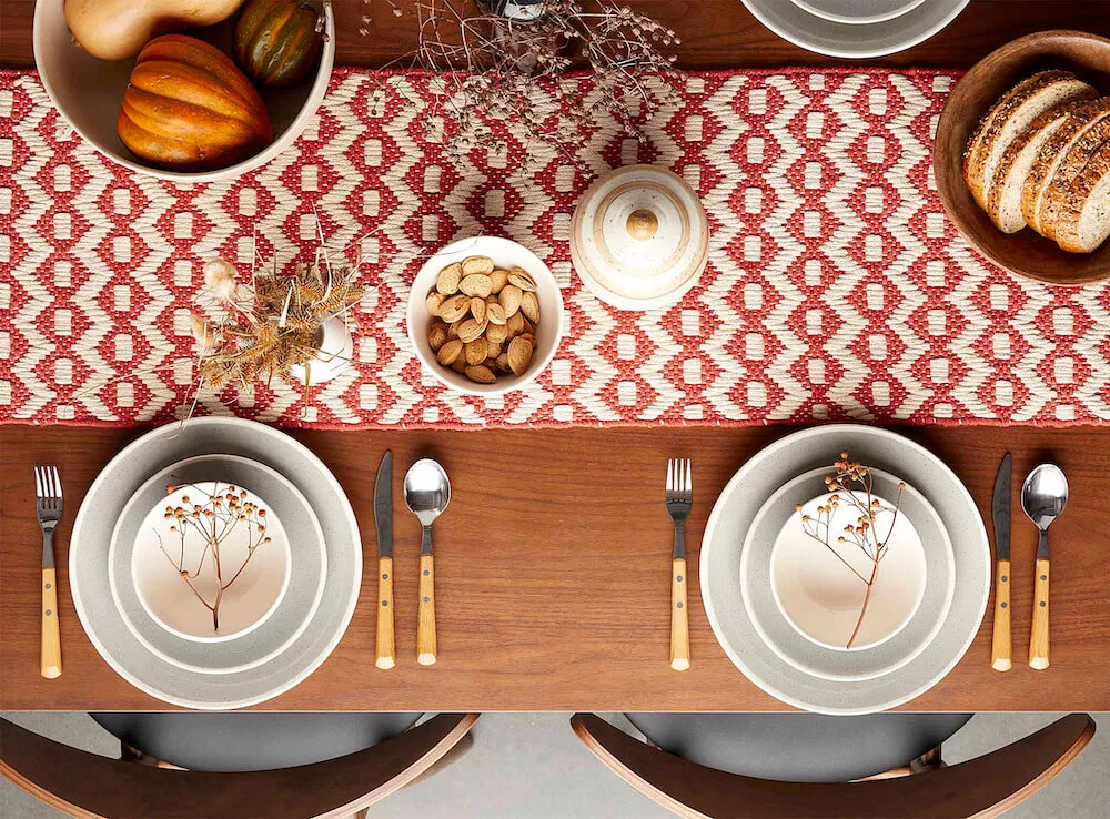 A lovely tablescape is one of our favourite ways to decorate for each new season. This fall, we’re creating a textured tablescape with a woven table runner in autumnal tones, warm woods, rustic ceramics, dried foliage, a collection of candles, and some touches of gold.