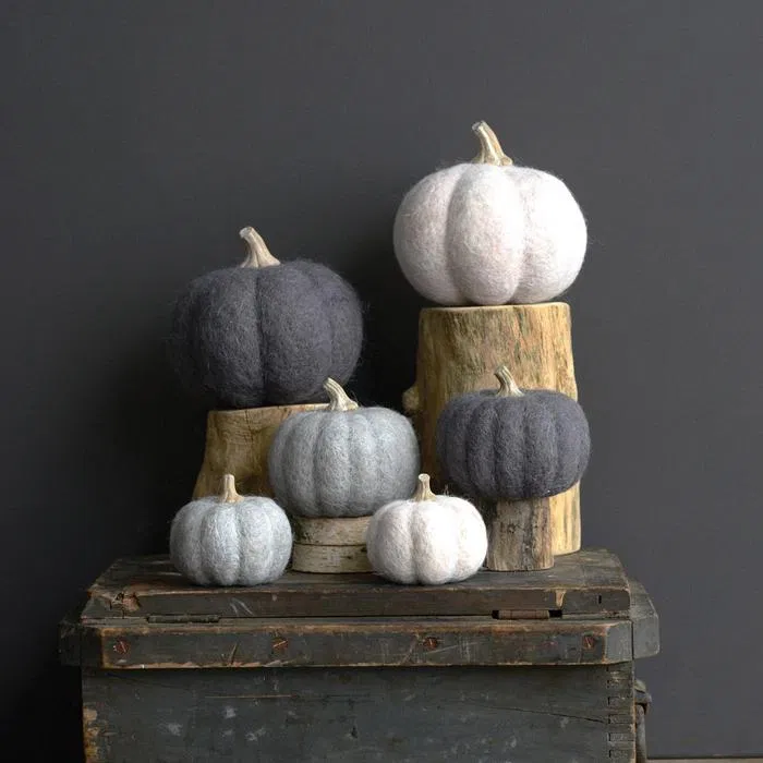 We’ll mix seasonal shapes, colors, and textures to create visual interest and dimension. To save time, you might want to invest in decorative elements that you can reuse each year, like these cute wool pumpkins from Le Clair Decor (LD Shoppe). Add to cart!