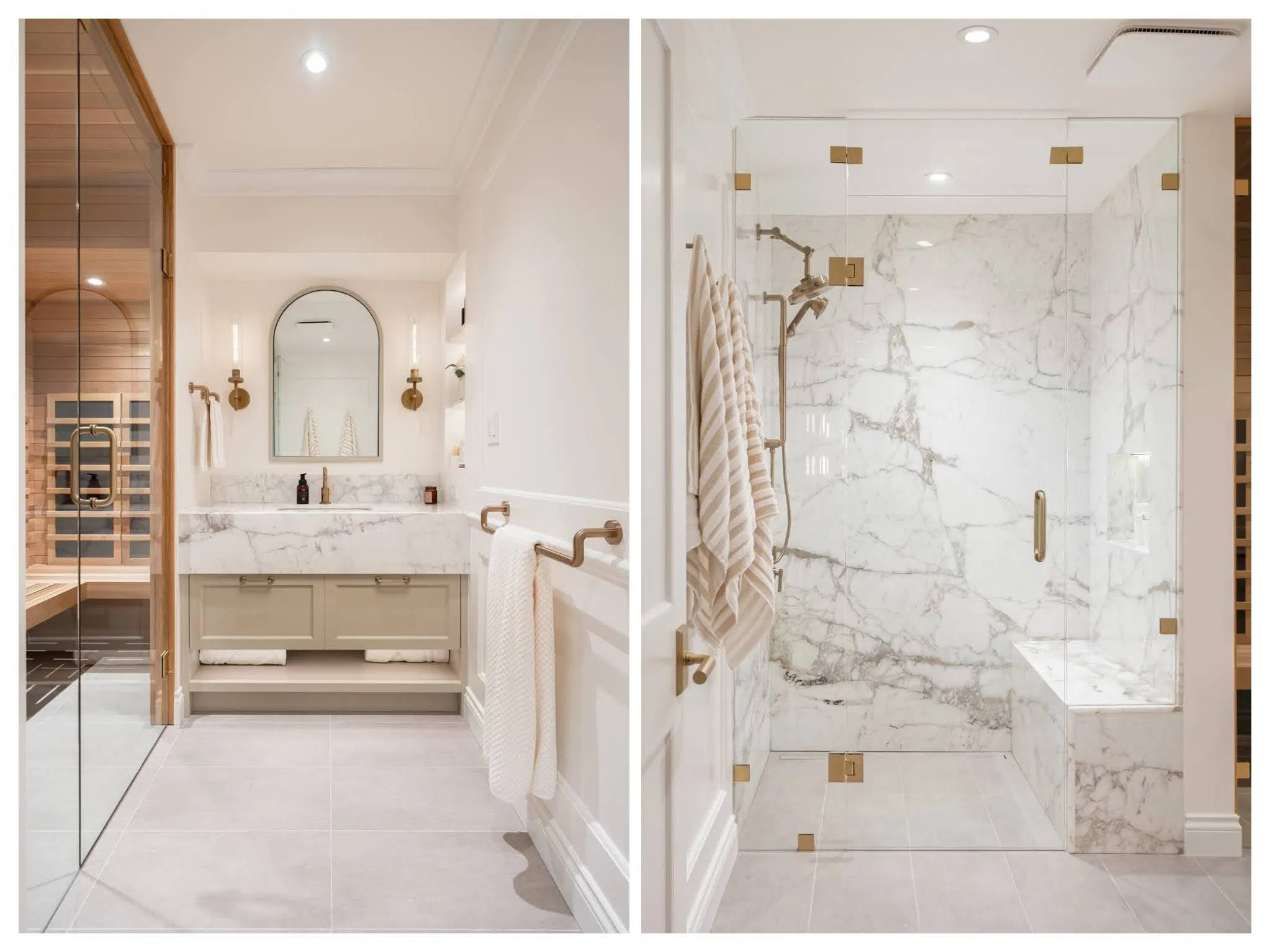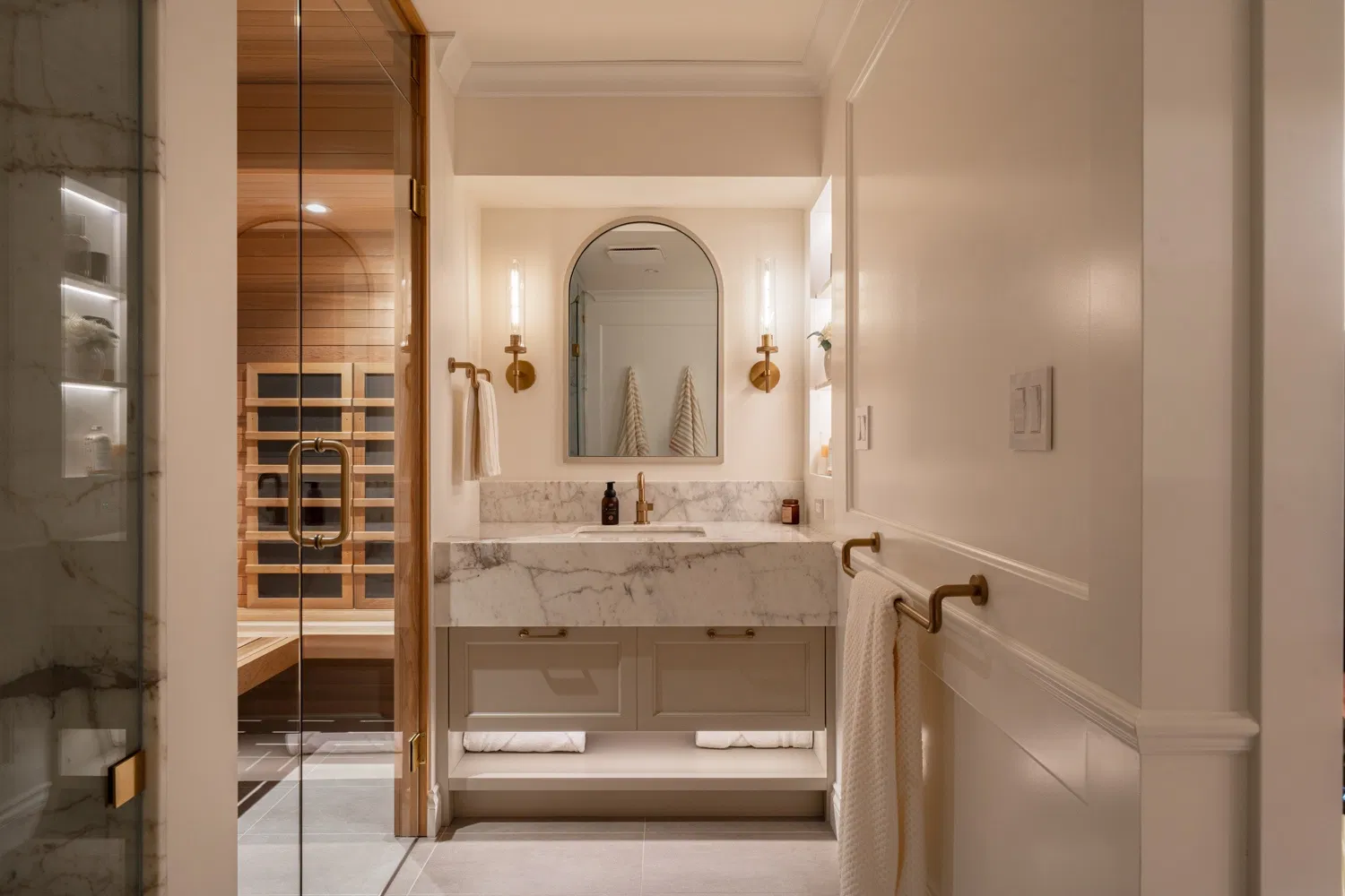 Rich marble, layered lighting, thoughtful detailing, and the warmth of the sauna all work together to create a cohesive retreat. It’s proof that with careful planning and craftsmanship, even a basement bathroom can become a sanctuary.