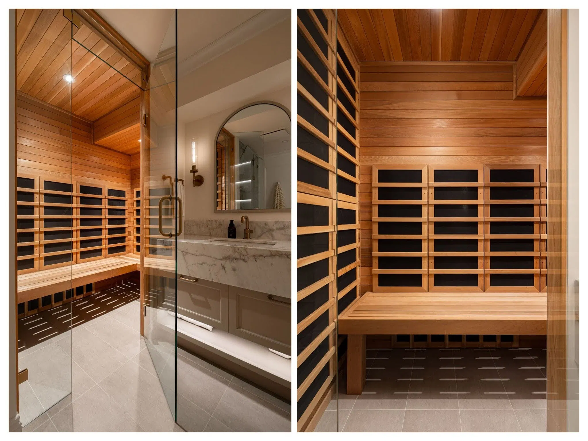Comfortably fitting up to three people, the sauna’s glass doors allow the warmth of the wood to infuse the rest of the space, and iIntegrated audio adds to the premium wellness experience.