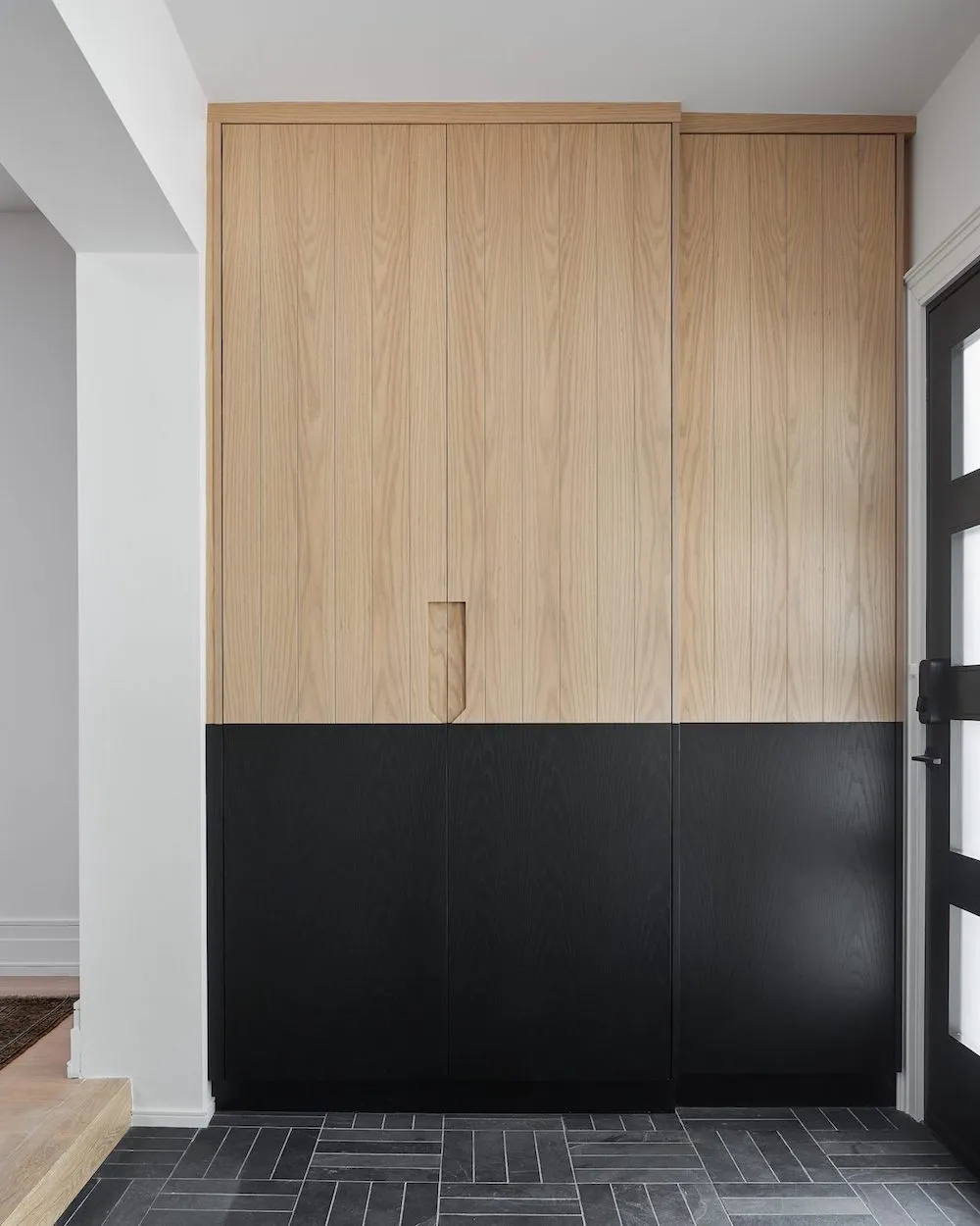Soft, warm colours and natural textures make this entryway space inviting, and help it blend into the rest of the home. Designer Sarah Baeumler converted an under-utilized corner into a functional mudroom with two tall storage units connected by a built-in wooden bench.