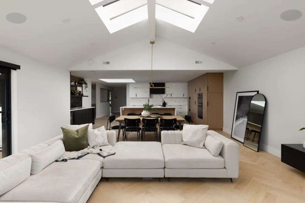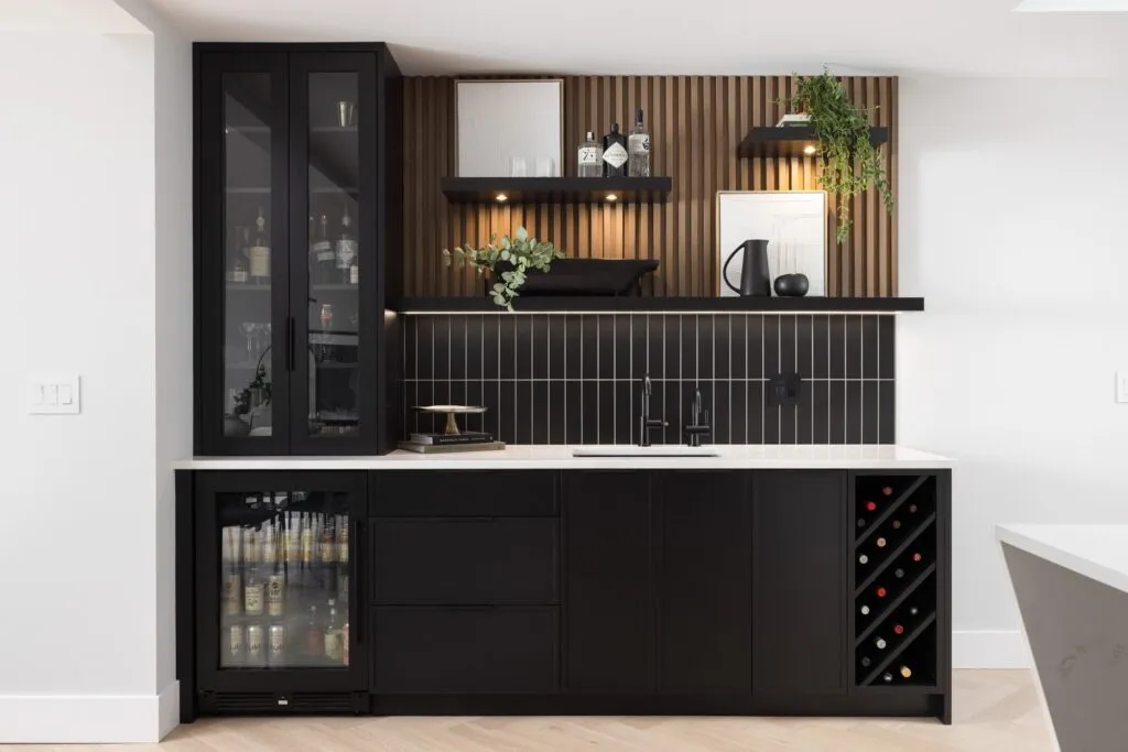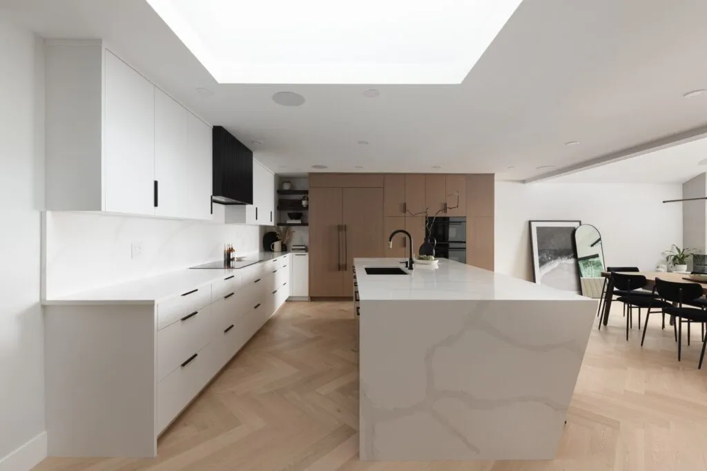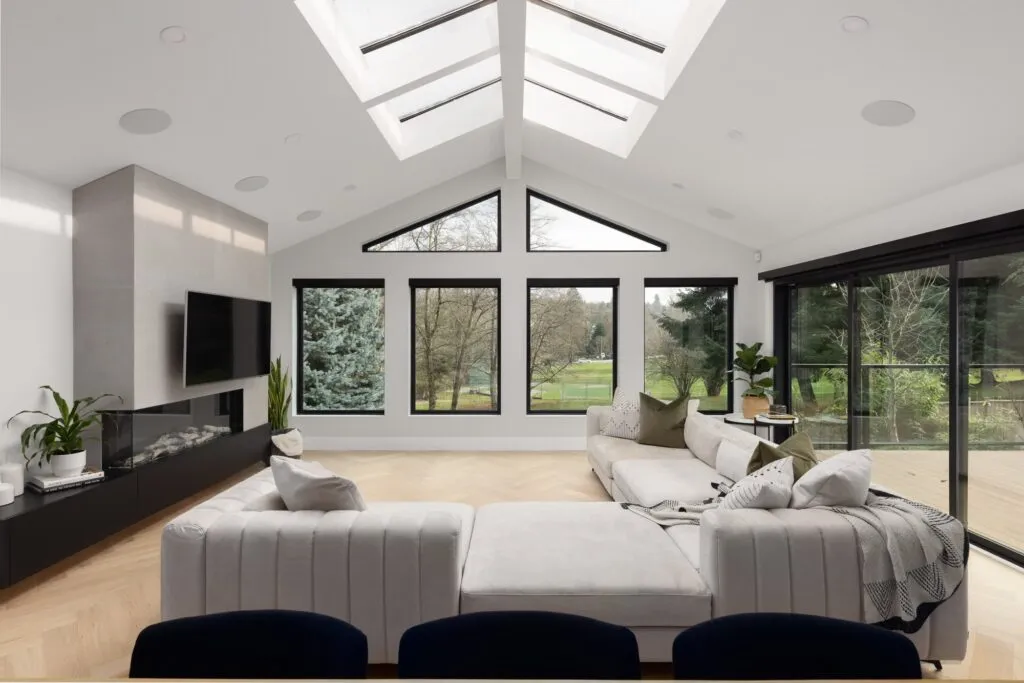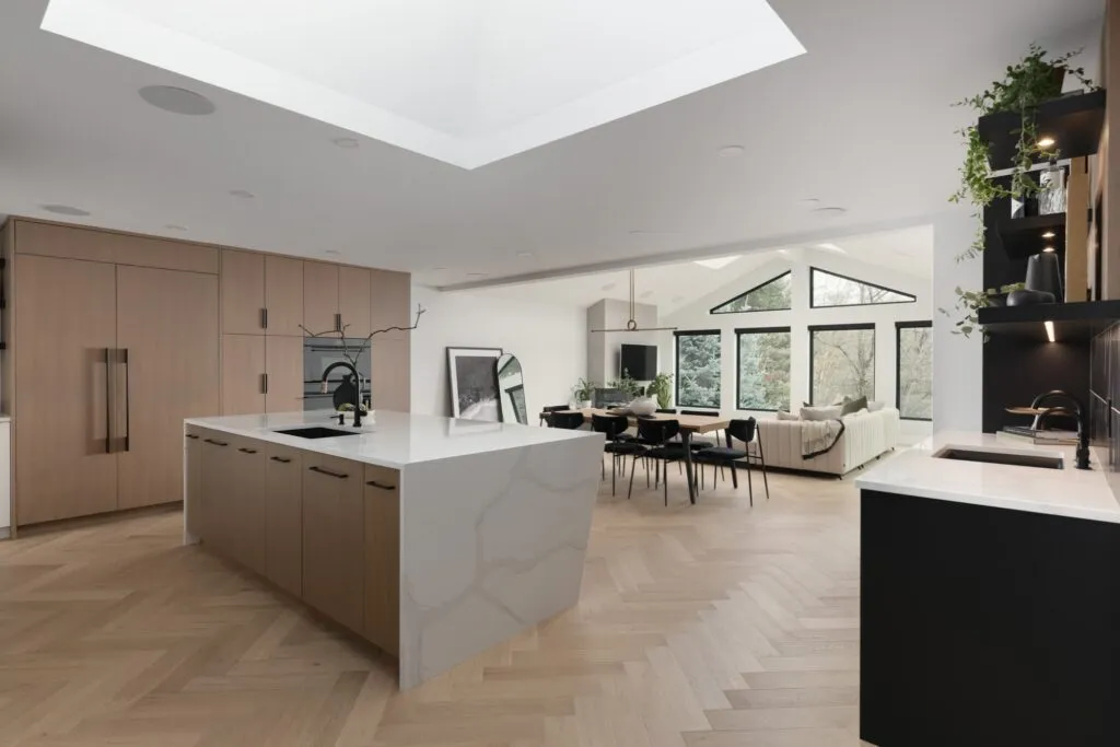 This comprehensive renovation refreshed a 1966 two-level Burnaby home inside and out. The main floor was reimagined with updates to the entryway, living spaces, kitchen, bar, three bedrooms, and bathrooms—and finished with engineered hardwood floors. Walls were moved to expand the primary bedroom closet and enclose the living room at the front of the house. The kitchen, dining, and family room were combined into a light-filled great room. The basement now features a gym, media room, office, laundry and mudroom. A large rear deck with a new sliding patio door enhances indoor-outdoor living.