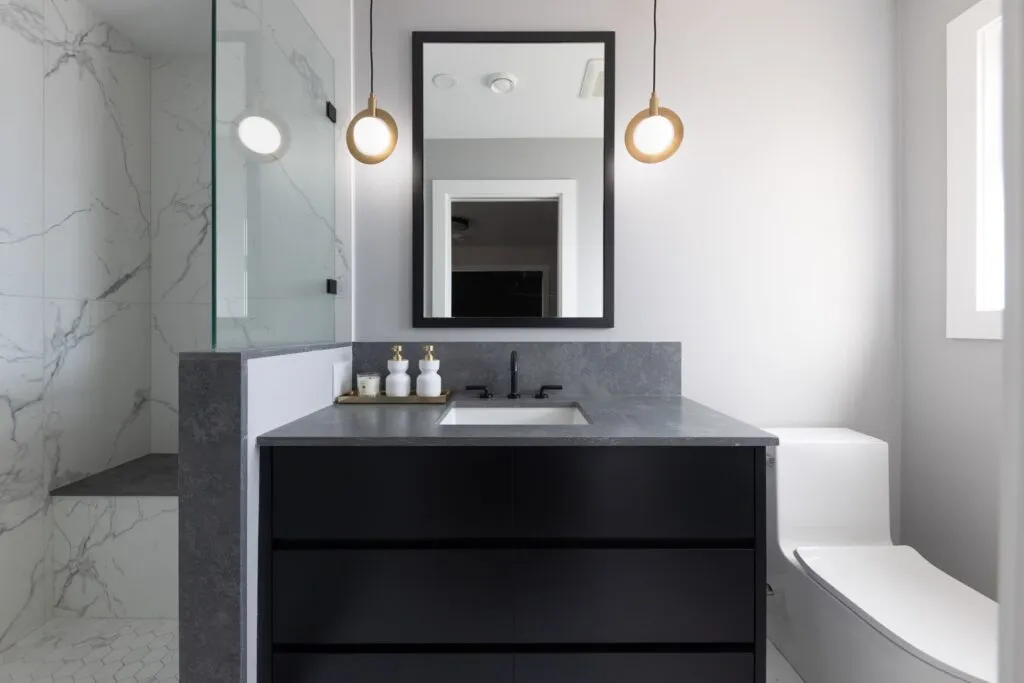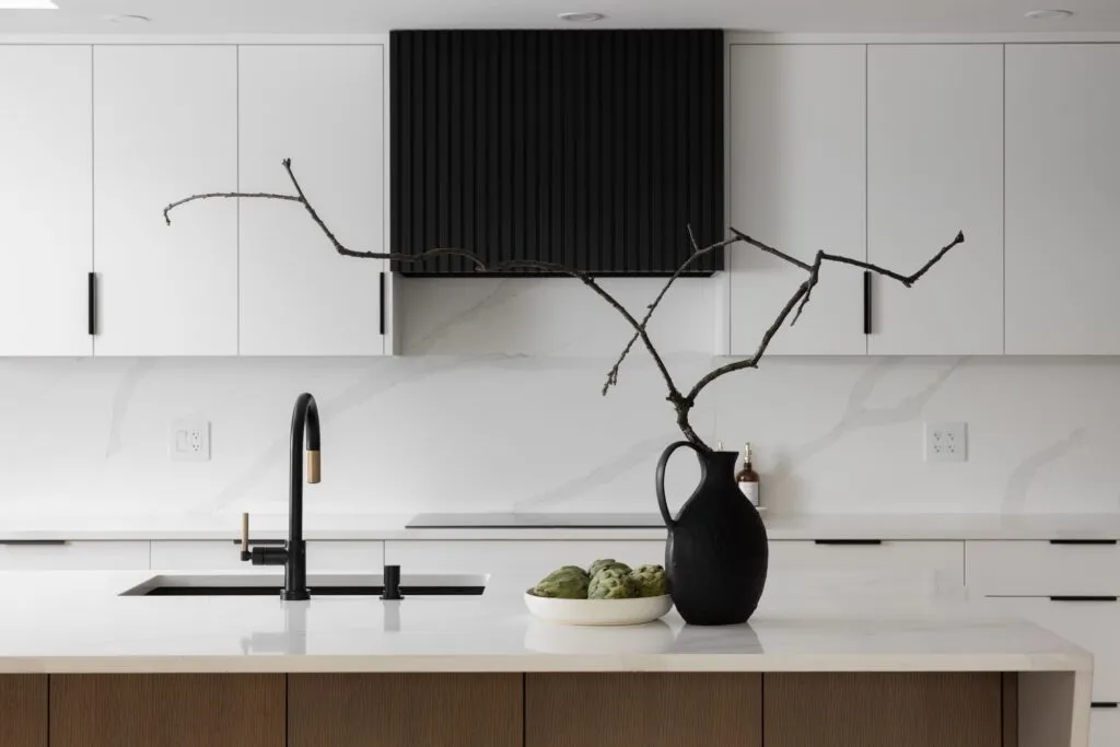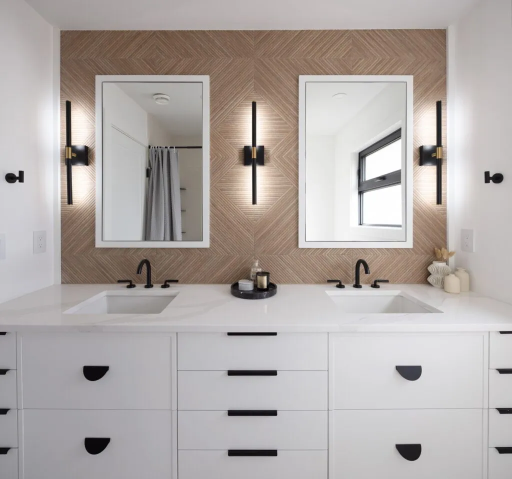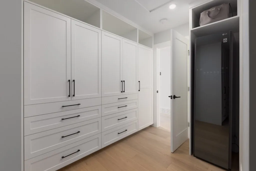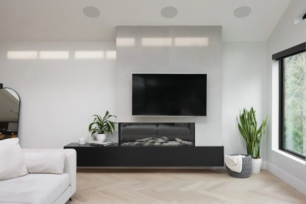 This comprehensive renovation refreshed a 1966 two-level Burnaby home inside and out. The main floor was reimagined with updates to the entryway, living spaces, kitchen, bar, three bedrooms, and bathrooms—and finished with engineered hardwood floors. Walls were moved to expand the primary bedroom closet and enclose the living room at the front of the house. The kitchen, dining, and family room were combined into a light-filled great room. The basement now features a gym, media room, office, laundry and mudroom. A large rear deck with a new sliding patio door enhances indoor-outdoor living.