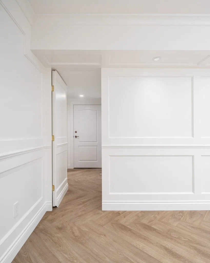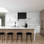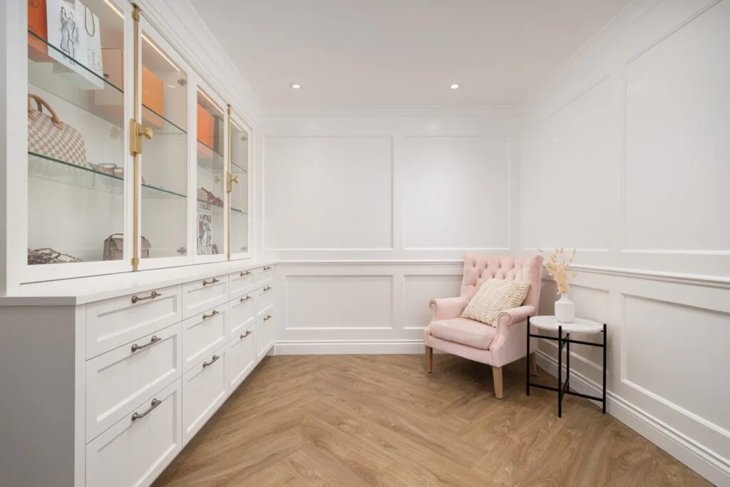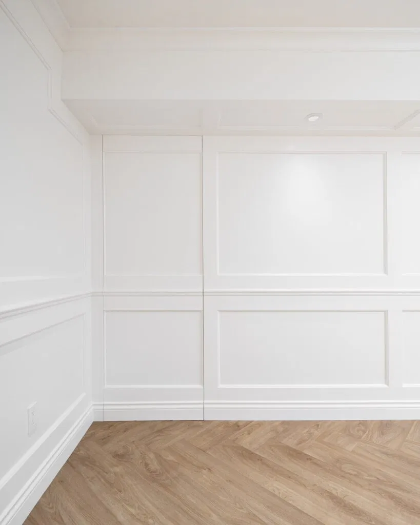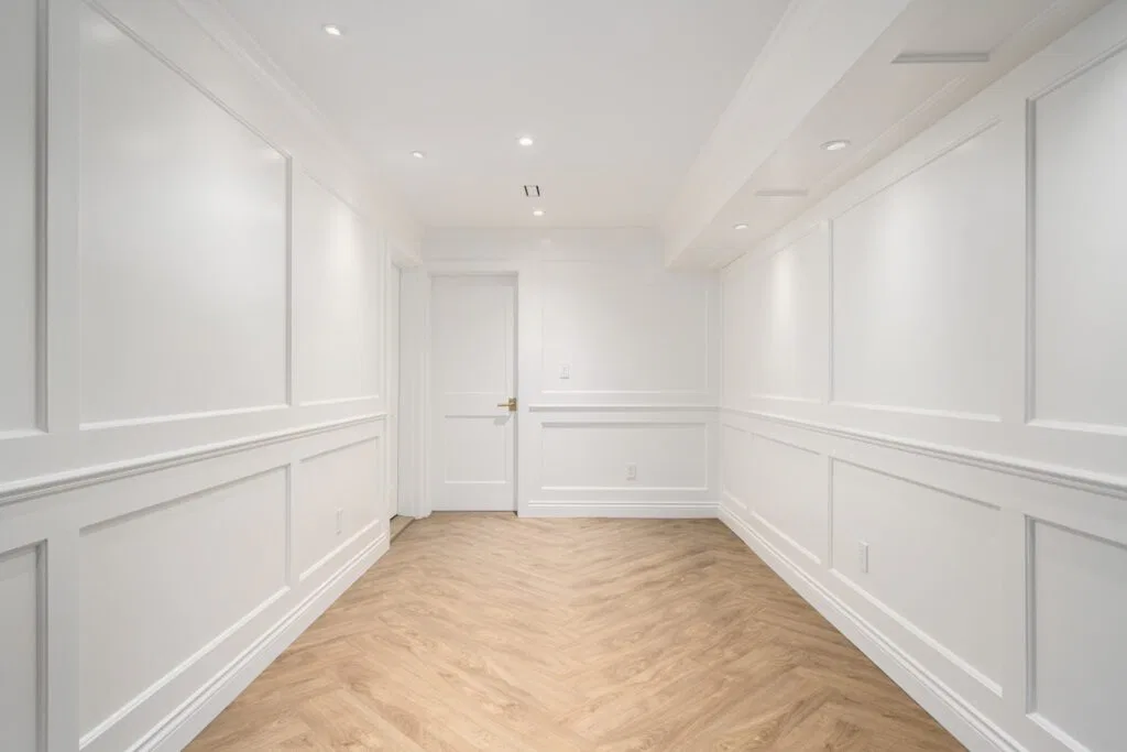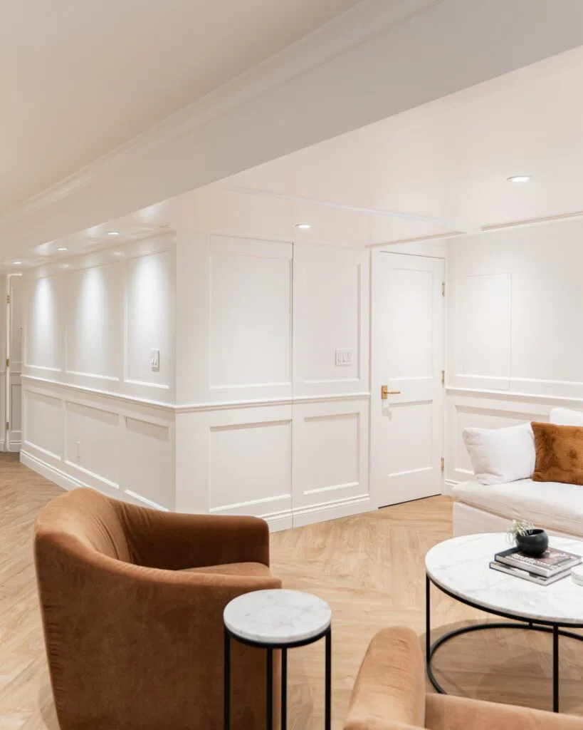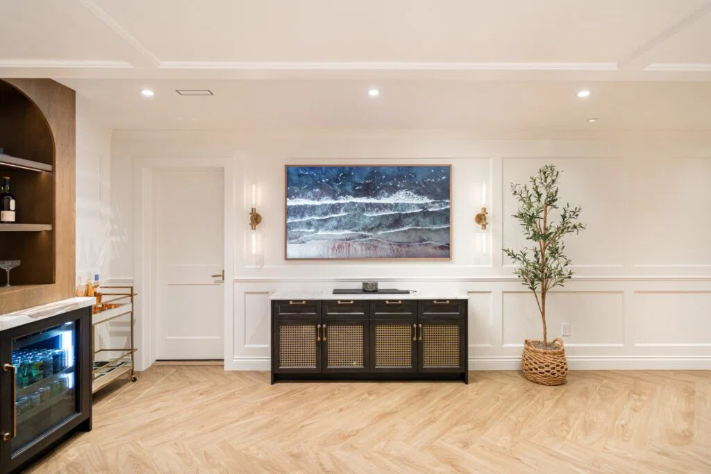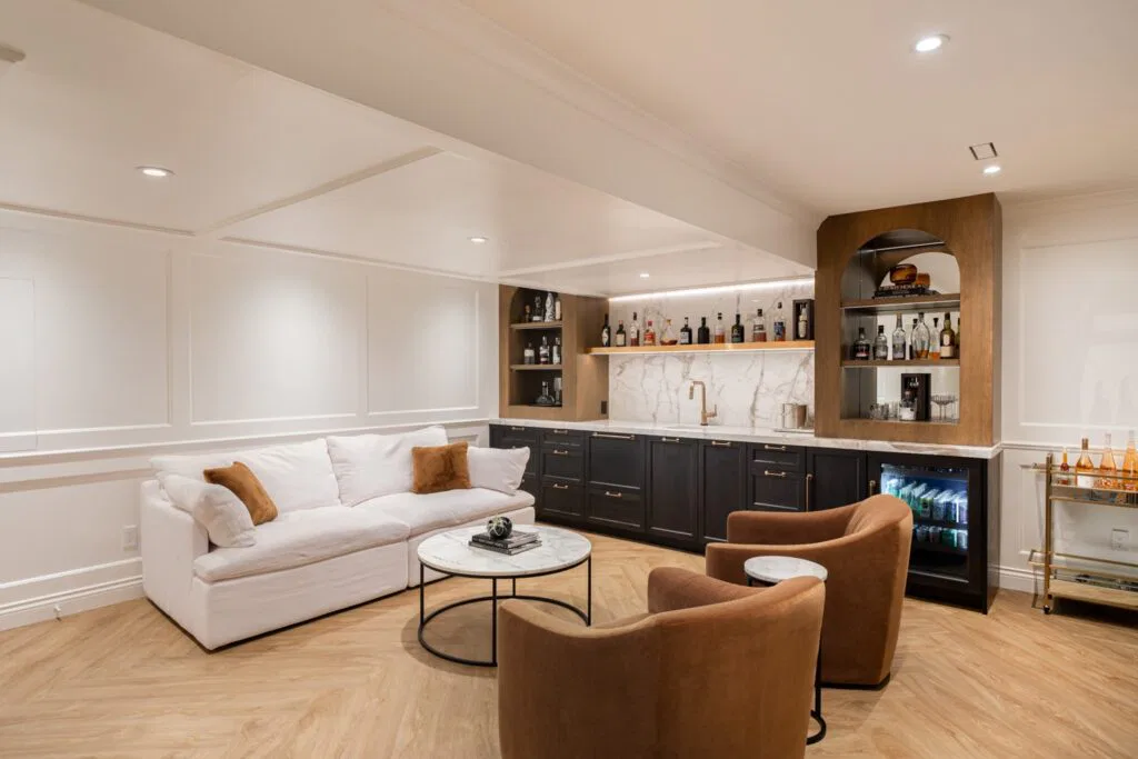 Inspired by the timeless elegance of high-end hotels, this basement renovation completely transformed an unfinished Coquitlam home into an elegant and luxurious multi-purpose retreat encompassing a kickboxing gym, lounge, office, and spa bathroom. A hidden doorway conceals the mechanical and storage areas, while the lounge features a wet bar with custom millwork, arched liquor storage, and a marble backsplash.