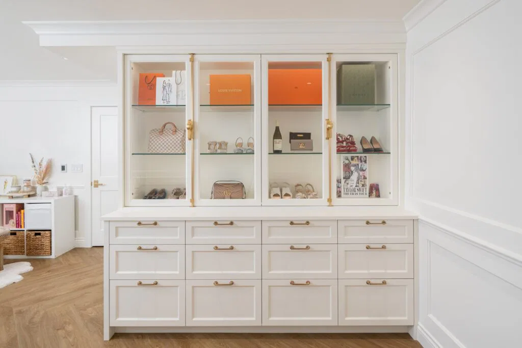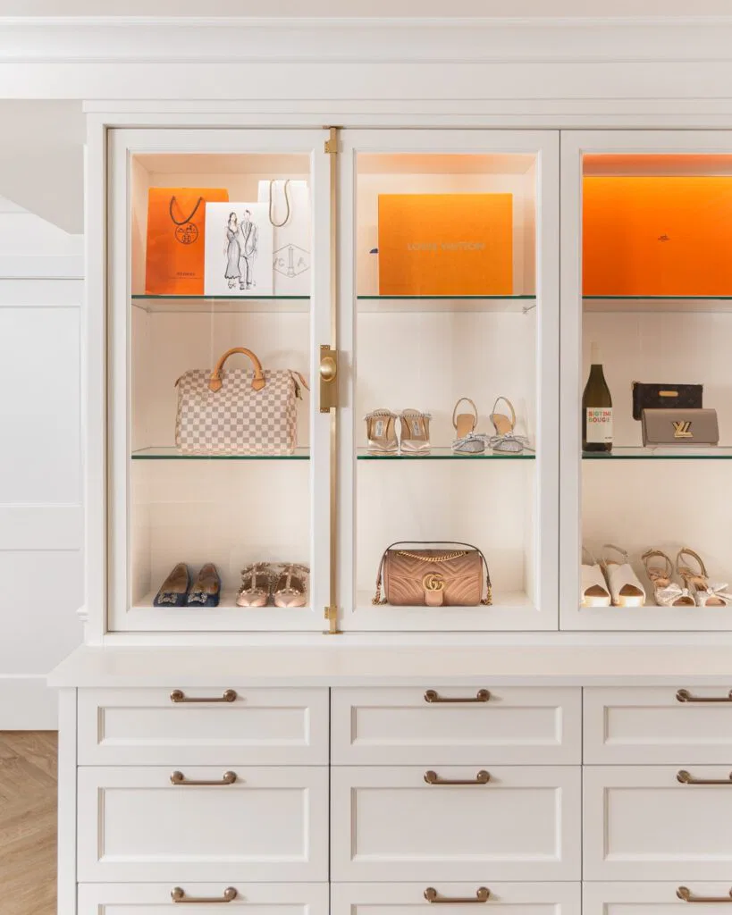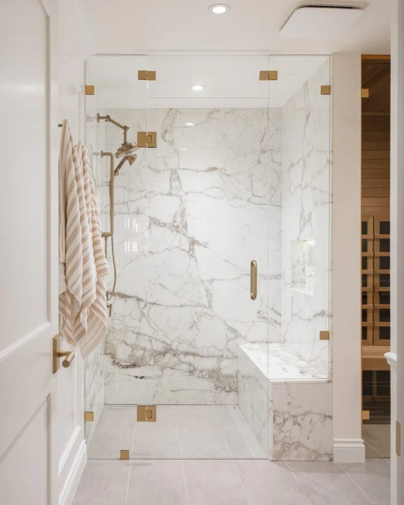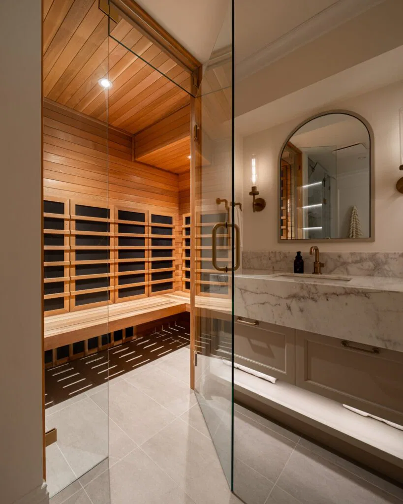 The luxurious bathroom is the centrepiece: Calacatta Vagli marble slab walls with dramatic grey veining and heated bench, a hemlock-clad infrared sauna, and walk-in shower with Brizo fixtures. Layered dimmable lighting completes the warm, restorative atmosphere. The office features a backlit display hutch, and smart storage solutions were added throughout.