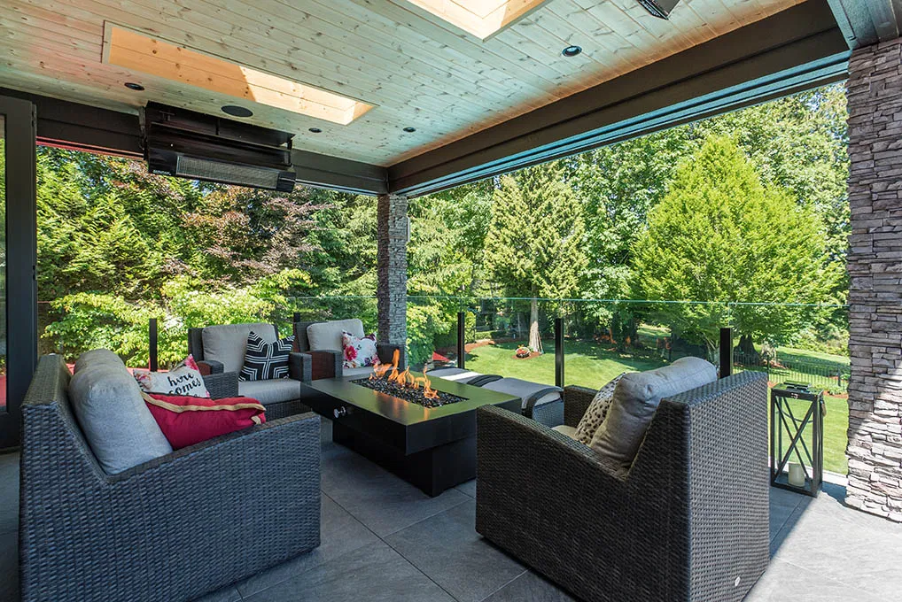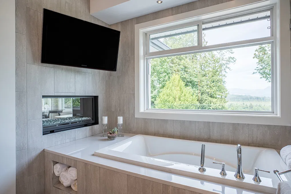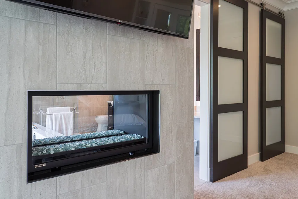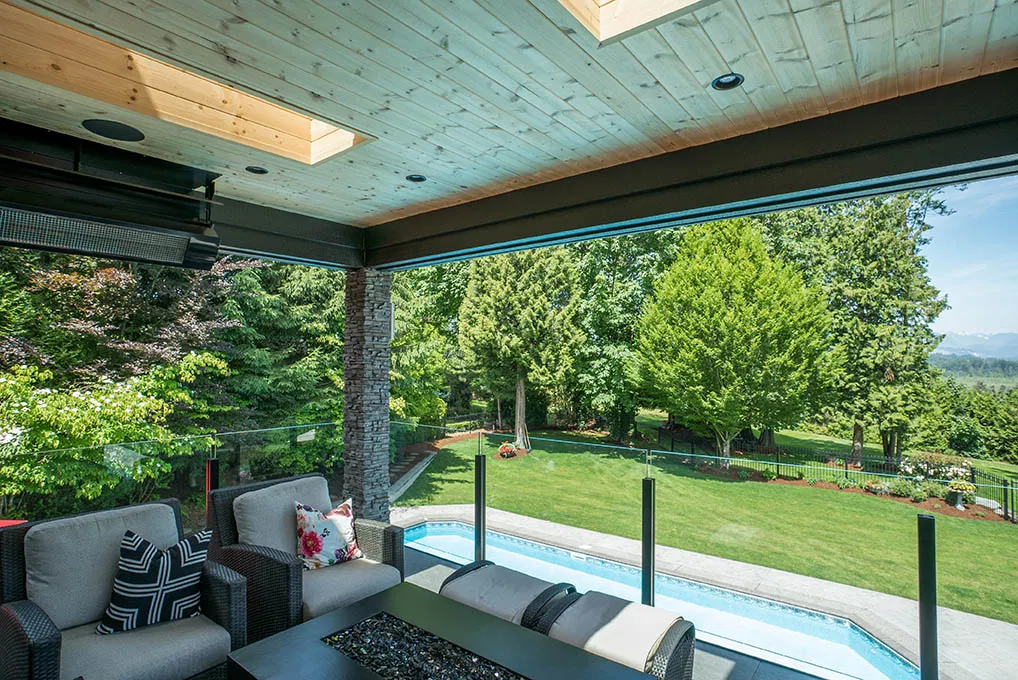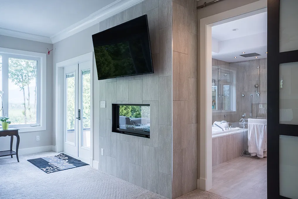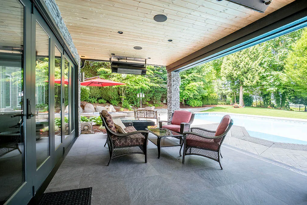 This house added an extensive covered patio for outdoor entertaining almost year-round. Skylights and lighter wood soffits brighten the space and make it more welcoming. Innovative folding eclipse doors were installed creating continuous sight lines from the kitchen-dining area to outside. When opened, the interior extends into a stunning outdoor living room with a modern fire pit and heaters. Topless glass railings maintain the views. An outdoor kitchen is flanked in stonework and anchored by a serious built-in gas grill; and a new staircase leads to a beautiful tiled landing beside more poolside living space. The master bedroom and bathroom recieved custom tile work, flooring, sliding doors, cabinetry and a modern double-sided fireplace to bridge the two rooms.