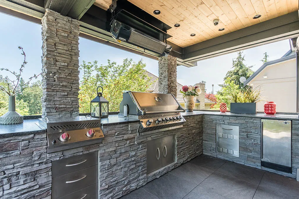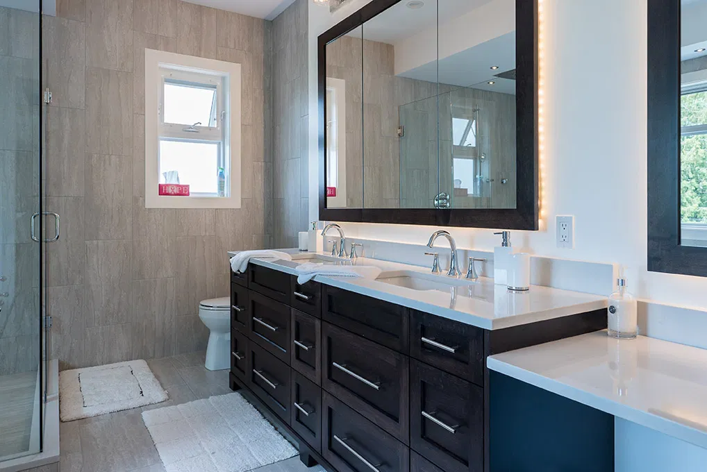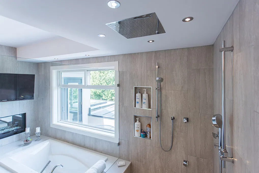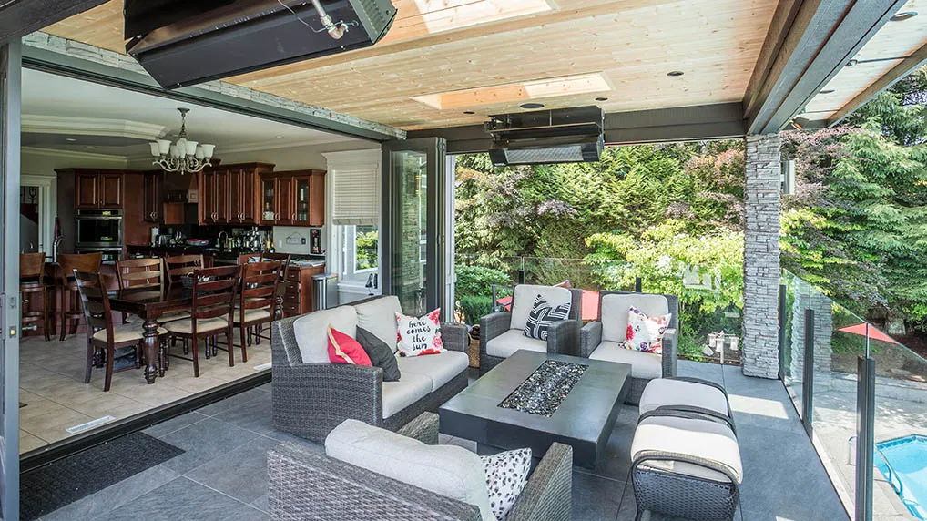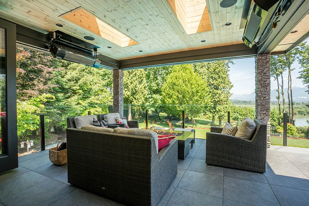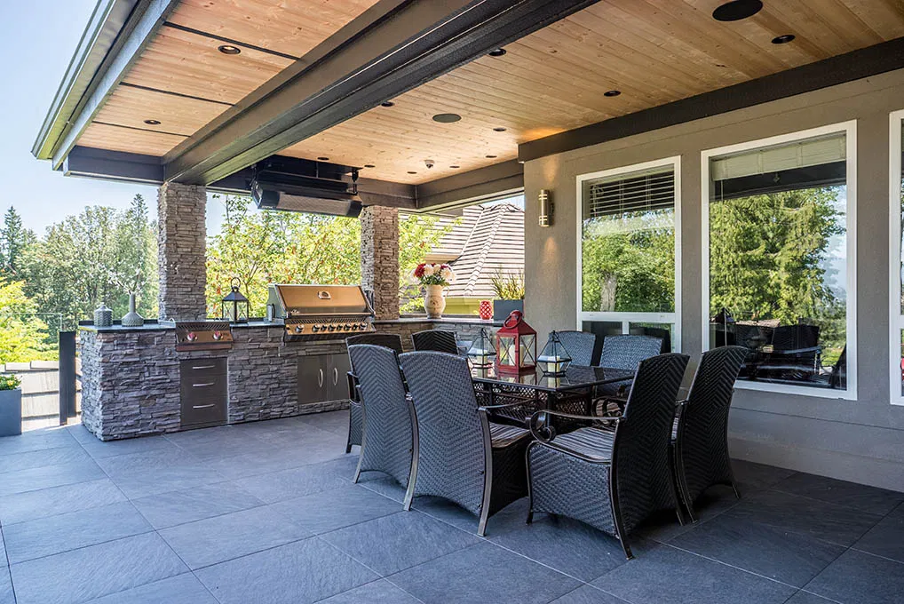 This house added an extensive covered patio for outdoor entertaining almost year-round. Skylights and lighter wood soffits brighten the space and make it more welcoming. Innovative folding eclipse doors were installed creating continuous sight lines from the kitchen-dining area to outside. When opened, the interior extends into a stunning outdoor living room with a modern fire pit and heaters. Topless glass railings maintain the views. An outdoor kitchen is flanked in stonework and anchored by a serious built-in gas grill; and a new staircase leads to a beautiful tiled landing beside more poolside living space. The master bedroom and bathroom recieved custom tile work, flooring, sliding doors, cabinetry and a modern double-sided fireplace to bridge the two rooms.