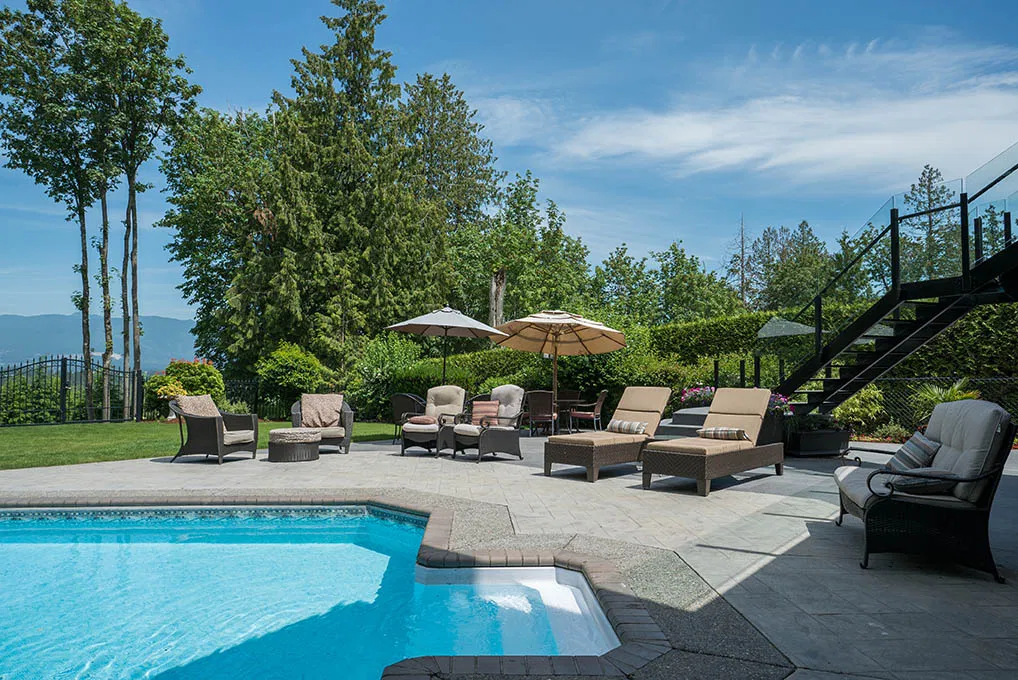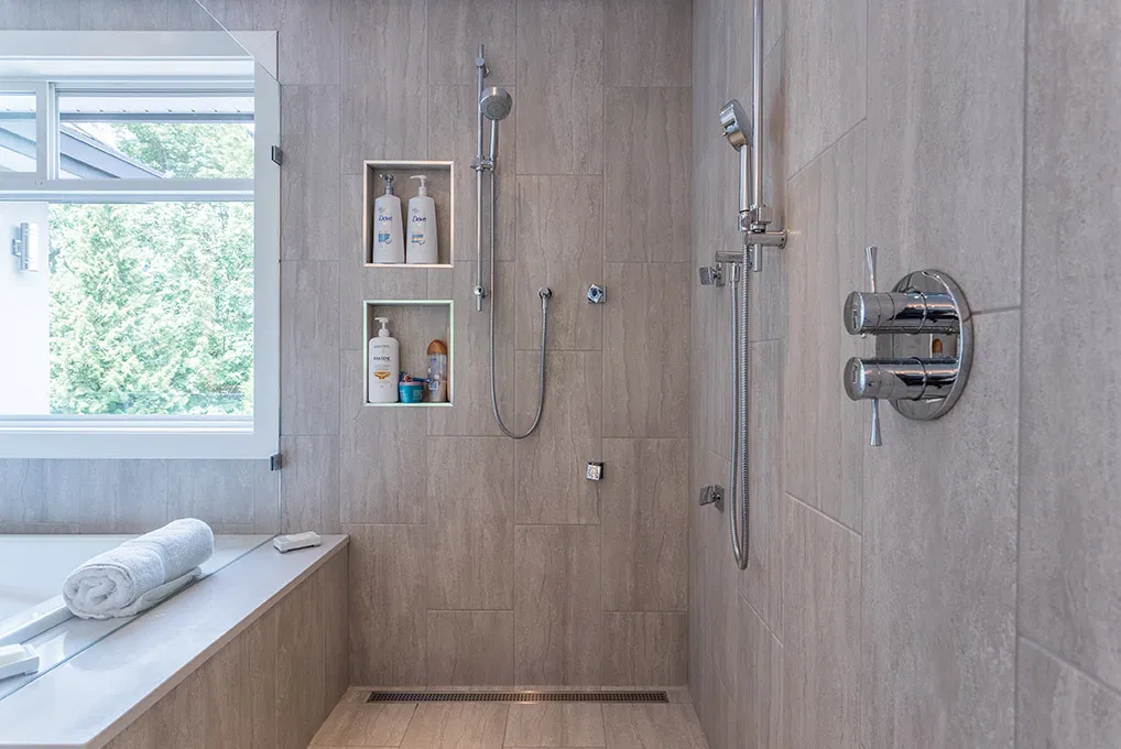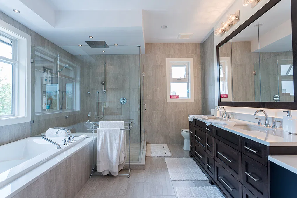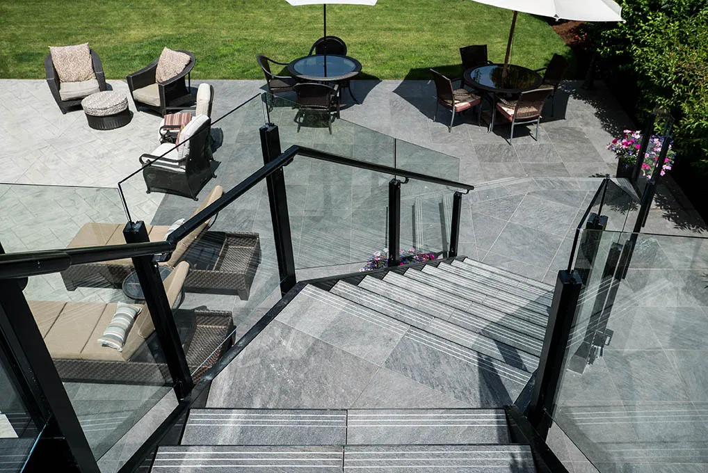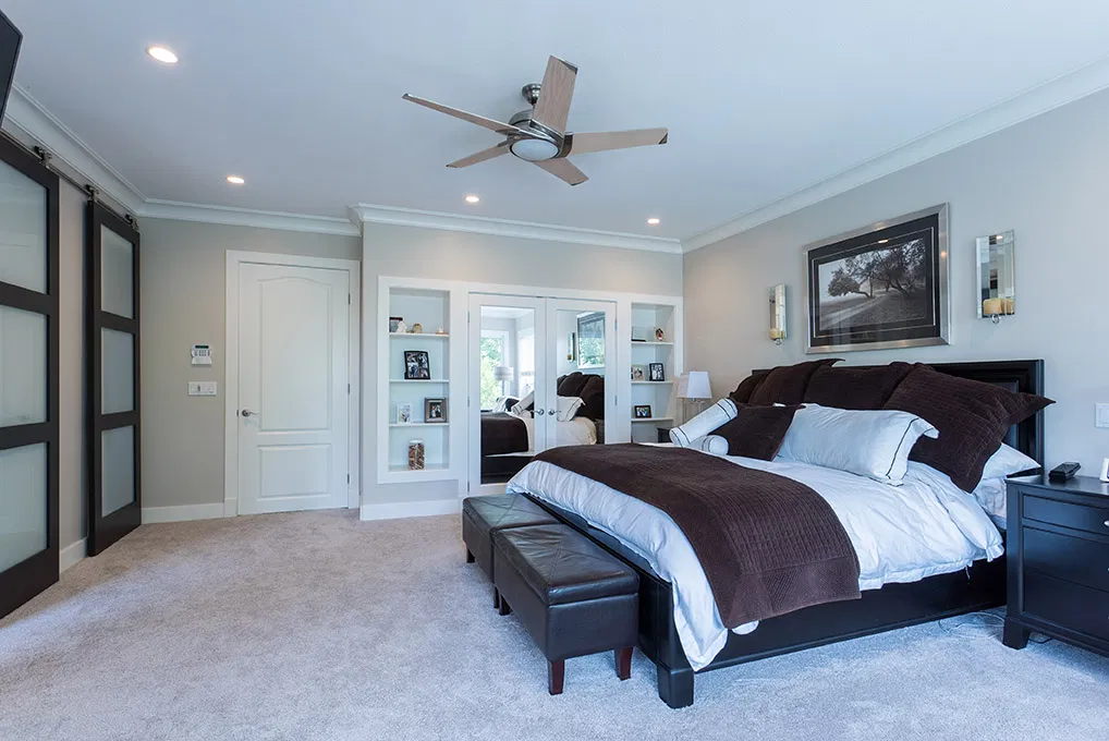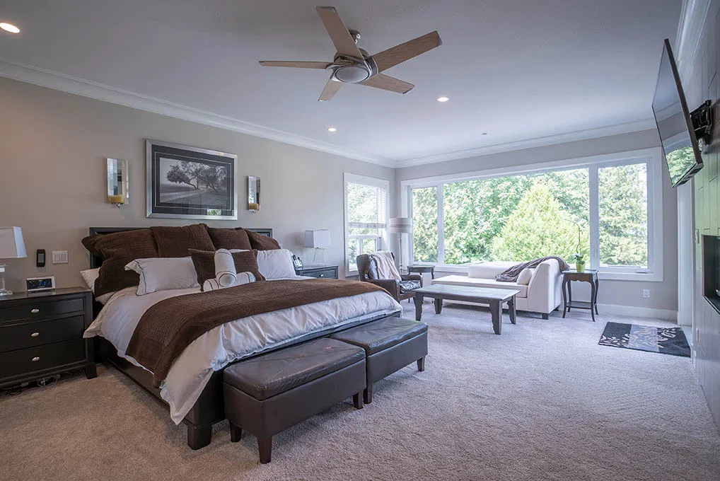 This house added an extensive covered patio for outdoor entertaining almost year-round. Skylights and lighter wood soffits brighten the space and make it more welcoming. Innovative folding eclipse doors were installed creating continuous sight lines from the kitchen-dining area to outside. When opened, the interior extends into a stunning outdoor living room with a modern fire pit and heaters. Topless glass railings maintain the views. An outdoor kitchen is flanked in stonework and anchored by a serious built-in gas grill; and a new staircase leads to a beautiful tiled landing beside more poolside living space. The master bedroom and bathroom recieved custom tile work, flooring, sliding doors, cabinetry and a modern double-sided fireplace to bridge the two rooms.