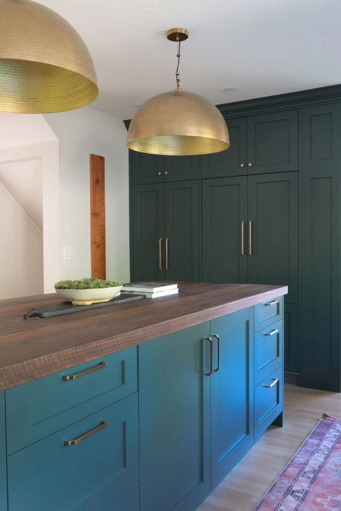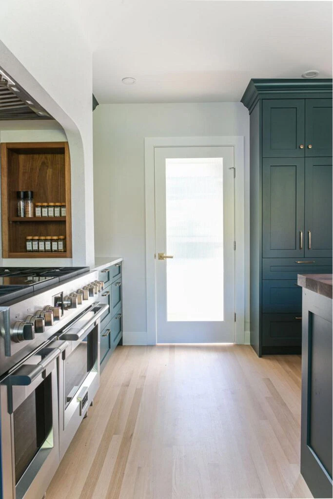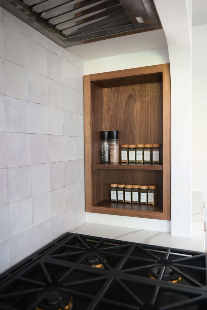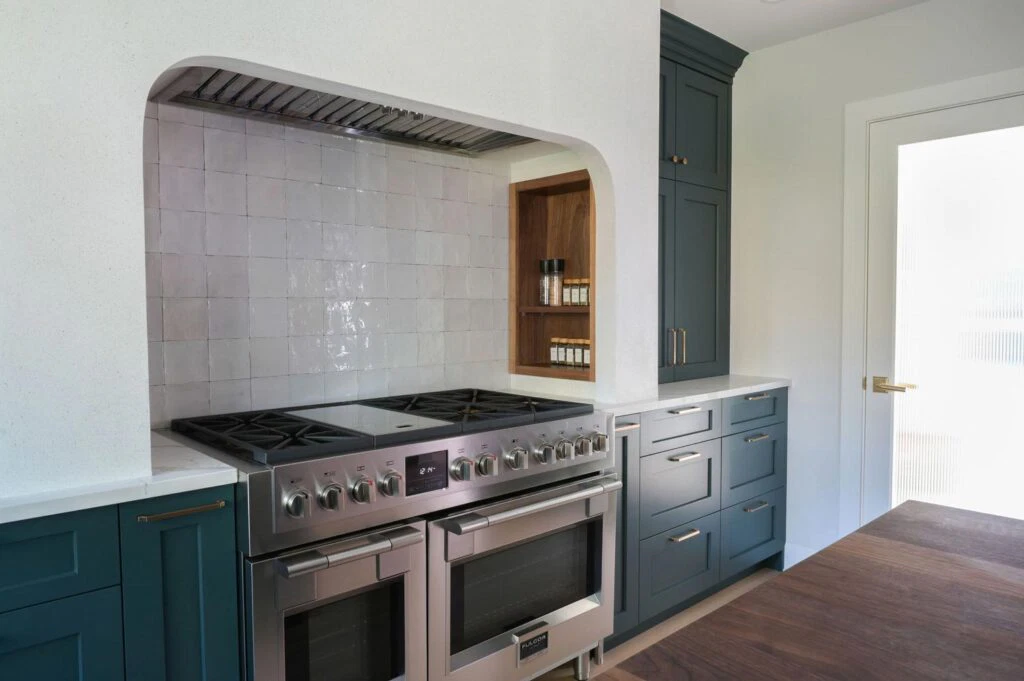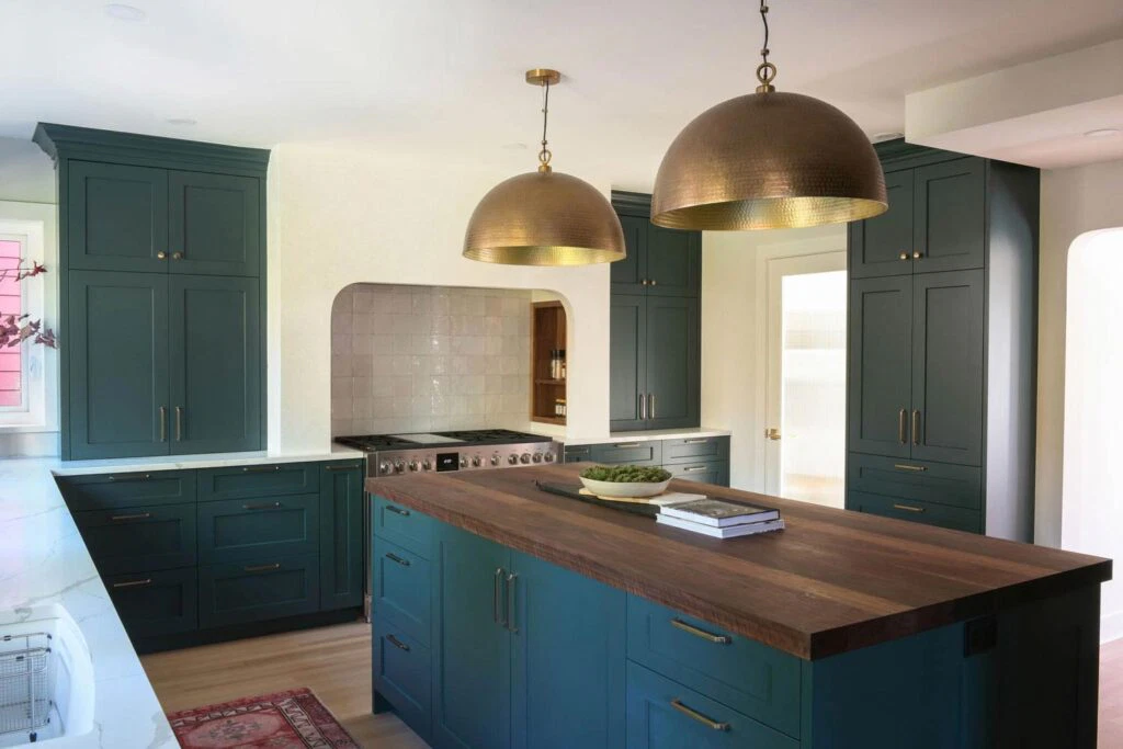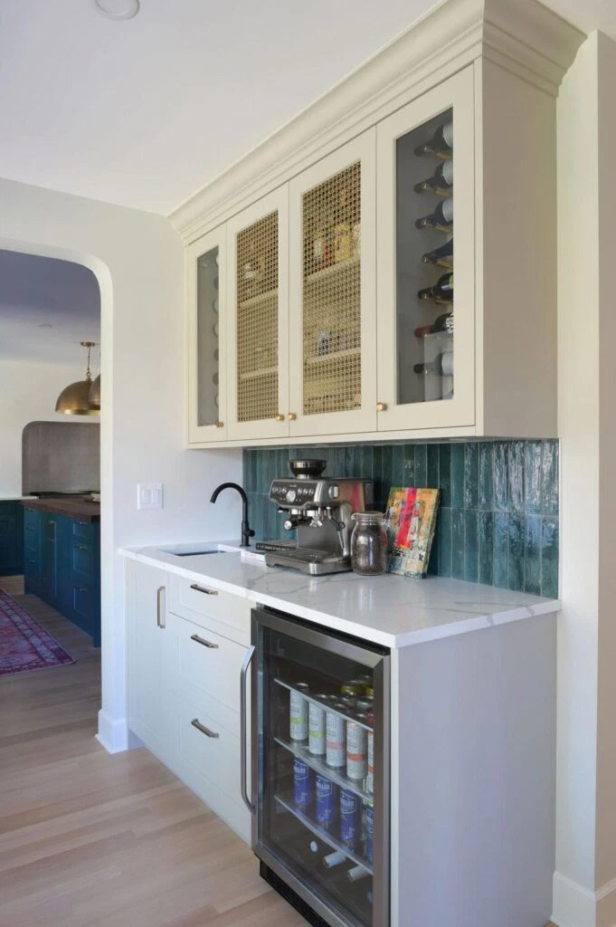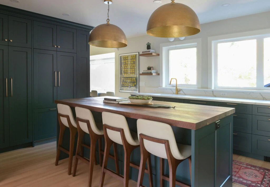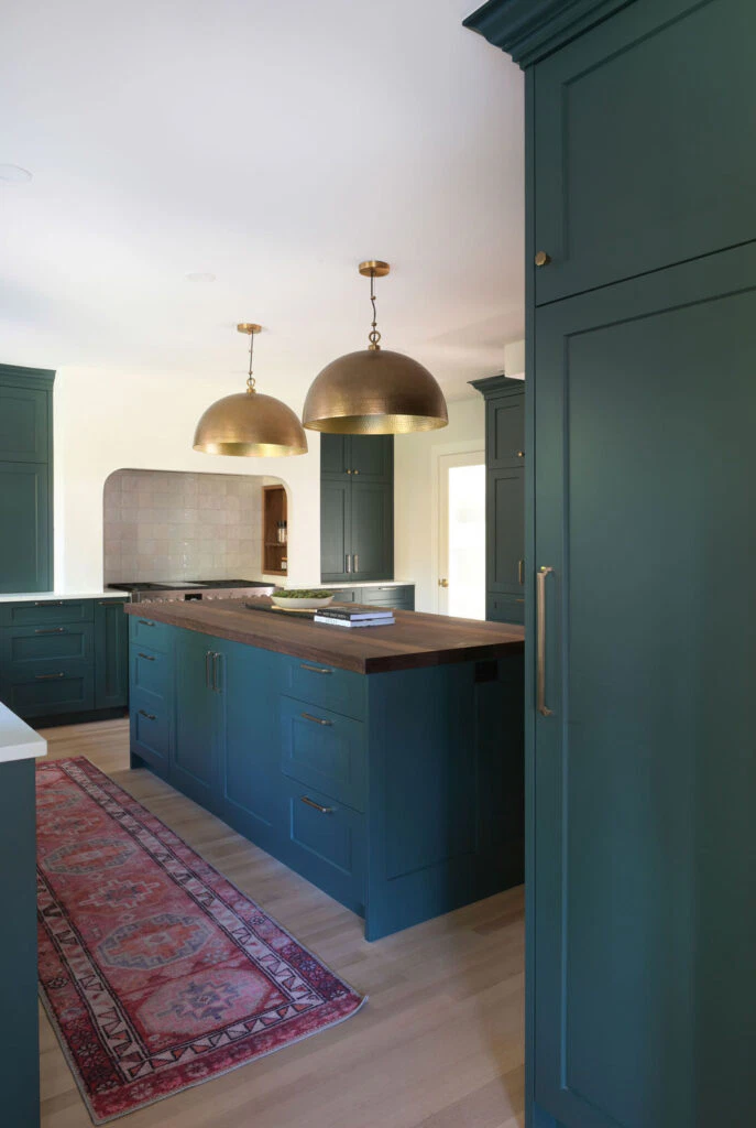 The fully customized kitchen features an arched plaster range hood, walnut butcher block island, a wet bar, and a study area connected to the kitchen. Original details like hardwood floors and crystal door knobs were preserved. The ensuite was transformed into a tranquil retreat with a freestanding tub, marble chevron tile, and brushed gold fixtures, resulting in a refined yet character-filled family home.