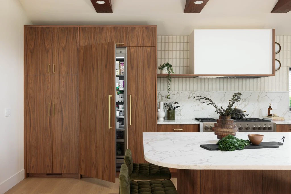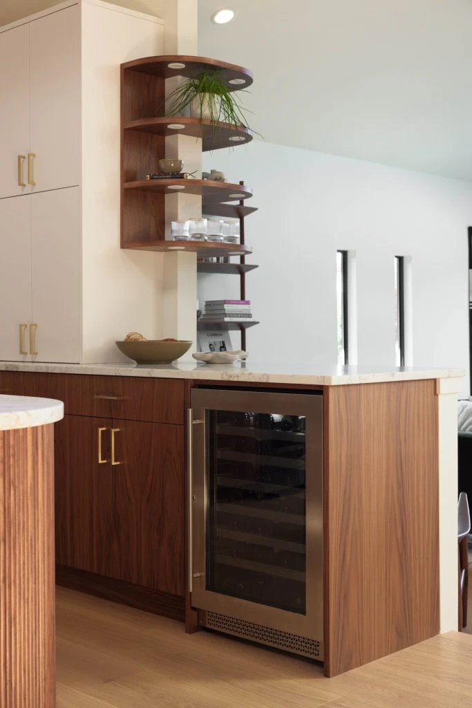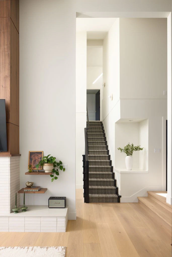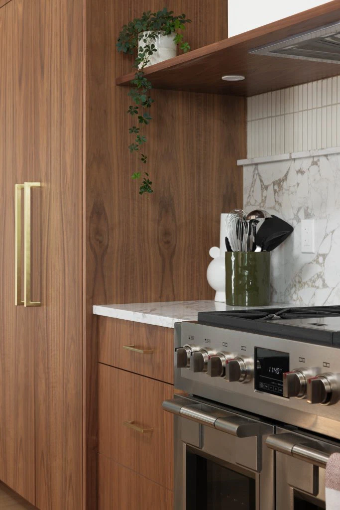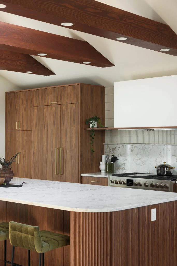 The kitchen, the heart of the project, anchors the main floor with walnut and white cabinetry, reeded wood detailing, and a sculptural island. This palette continues throughout with custom walnut built-ins, quartz surfaces, gold accents, and geometric touches. Minimal detailing and rich textures let the materials stand out, punctuated by olive green and earthy tones that nod to the era’s sensibility. Beyond the main living areas, the renovation refreshed the laundry room, bathroom, bedrooms, and staircase. White oak flooring spans the main level, complemented by wool carpeting and a tailored stair runner above. The result is a cohesive family-friendly home that marries mid-century inspiration with modern comfort.