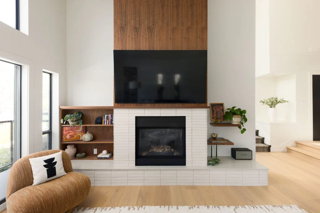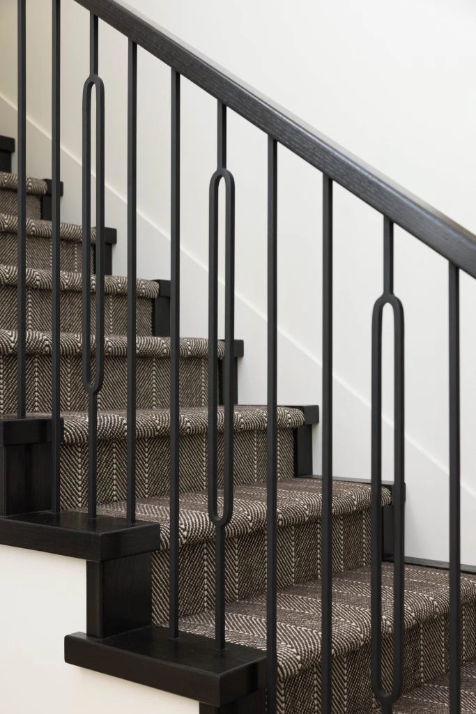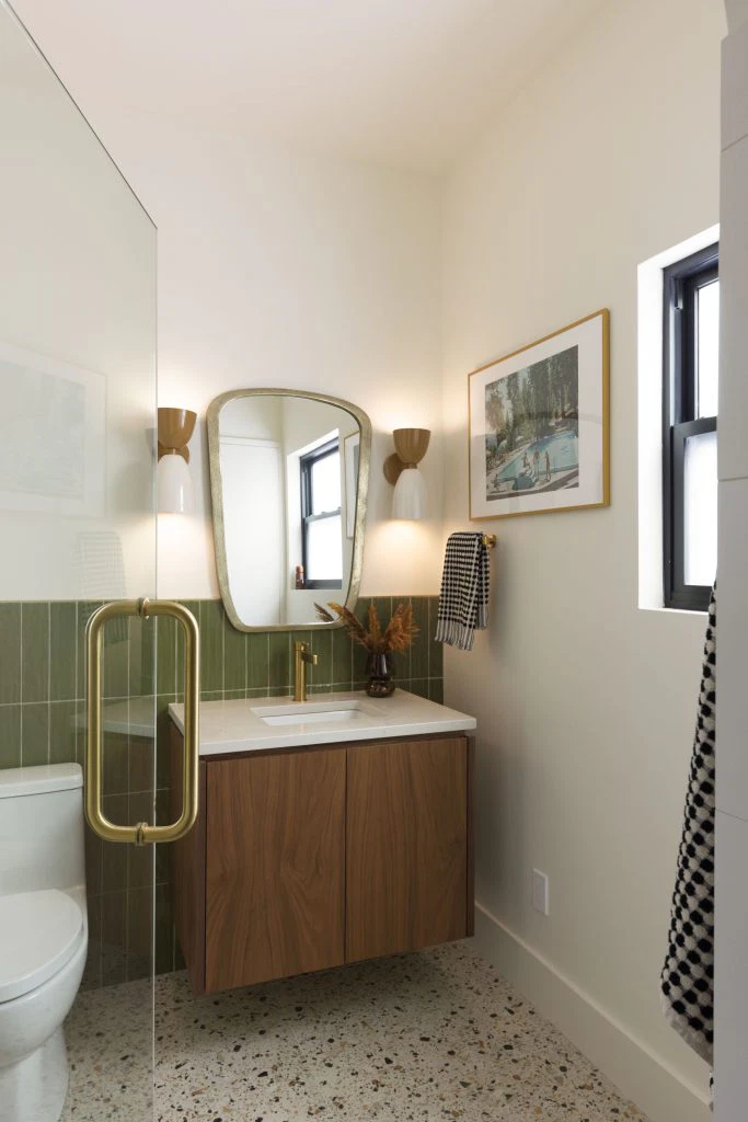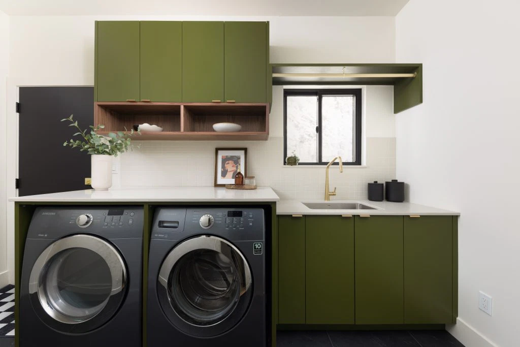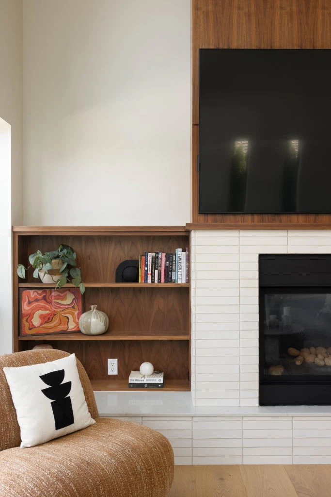 The kitchen, the heart of the project, anchors the main floor with walnut and white cabinetry, reeded wood detailing, and a sculptural island. This palette continues throughout with custom walnut built-ins, quartz surfaces, gold accents, and geometric touches. Minimal detailing and rich textures let the materials stand out, punctuated by olive green and earthy tones that nod to the era’s sensibility. Beyond the main living areas, the renovation refreshed the laundry room, bathroom, bedrooms, and staircase. White oak flooring spans the main level, complemented by wool carpeting and a tailored stair runner above. The result is a cohesive family-friendly home that marries mid-century inspiration with modern comfort.