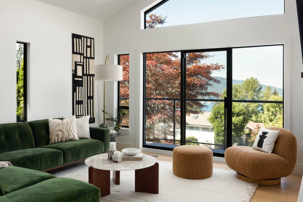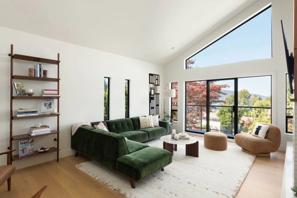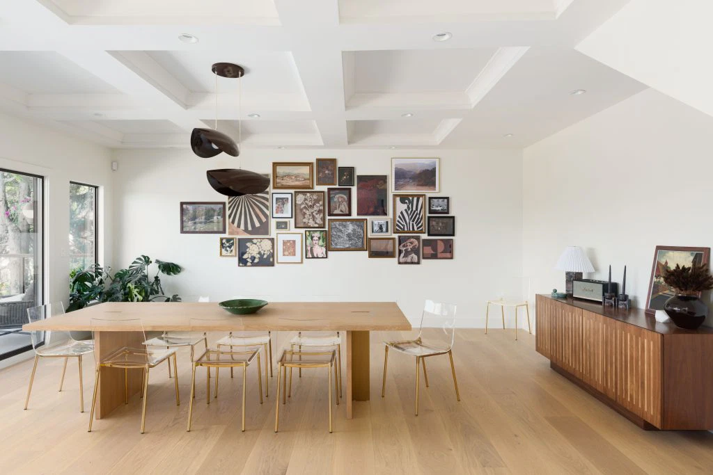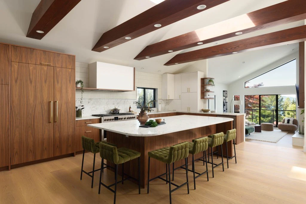 This renovation reimagined a 1970s home for a busy family of four, highlighting its vaulted ceilings and exposed beams with a mid-century modern aesthetic that blends clean lines, natural materials, and an easy connection to the outdoors—perfect for everyday living and gathering.