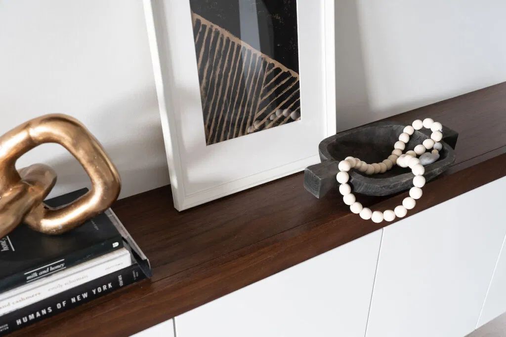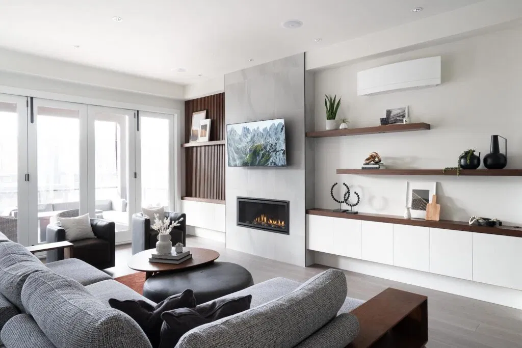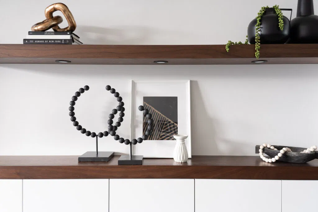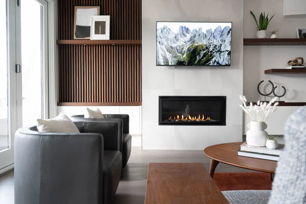 After moving into a brand new duplex, these clients asked NOVERO to add some design details to elevate the living space. The primary challenge: Hide the unsubtle electrical panel on the wall beside the fireplace—while still keeping it accessible. The solution: Design and build a beautiful walnut slat accent wall that perfectly reflects the owners’ modern style and creates a distinct focal point in the room. We incorporated plenty of storage to keep the minimalist space looking tidy, and floating shelves for display. We stained the shelves and cabinetry cap to match the slat wall.