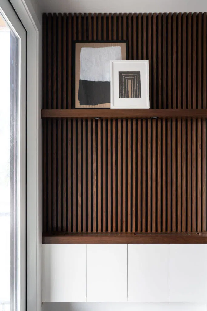 Not only do the clean vertical lines of the slats provide visual interest, but they also give the illusion that the ceilings are taller than they really are. Paired with the long run of modular cabinetry, the wood features add texture and warmth while reflecting the existing furnishings.