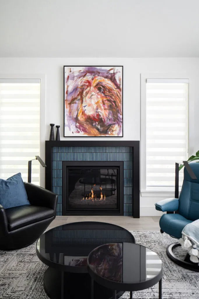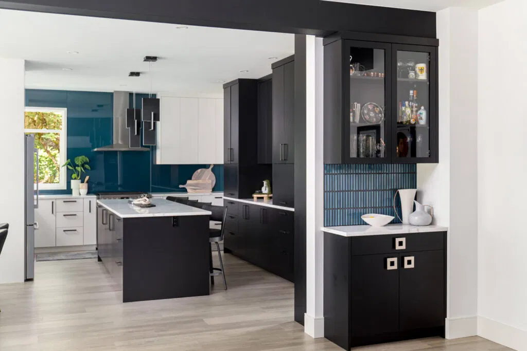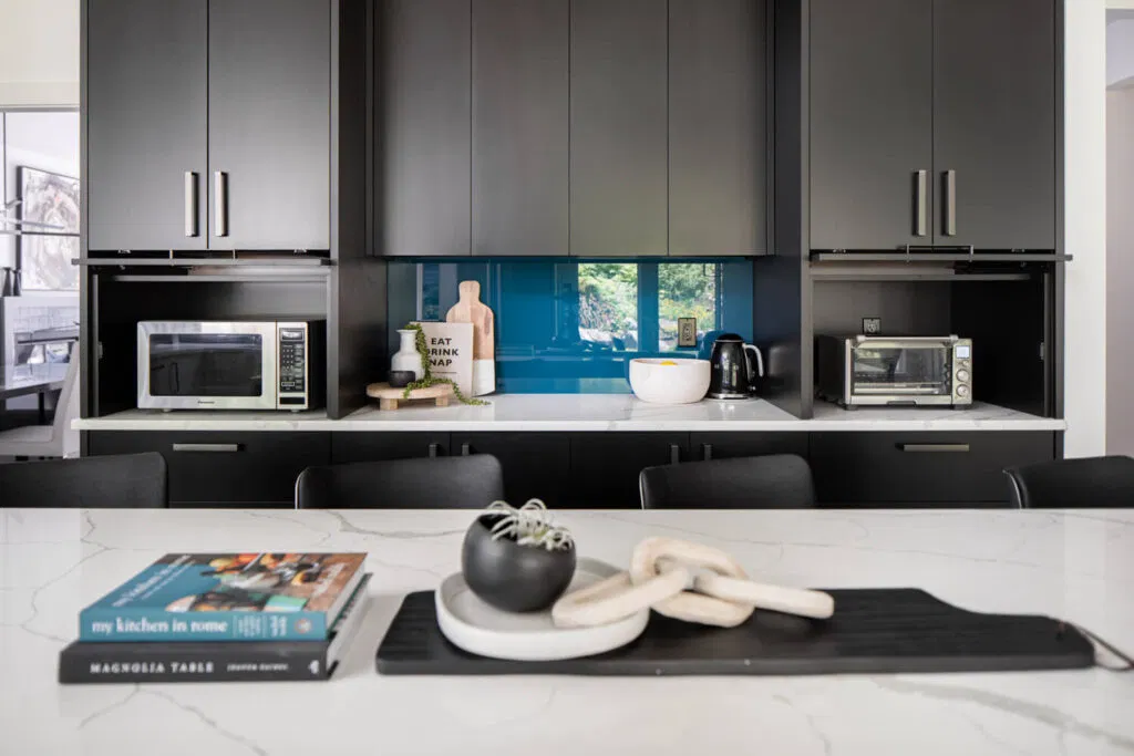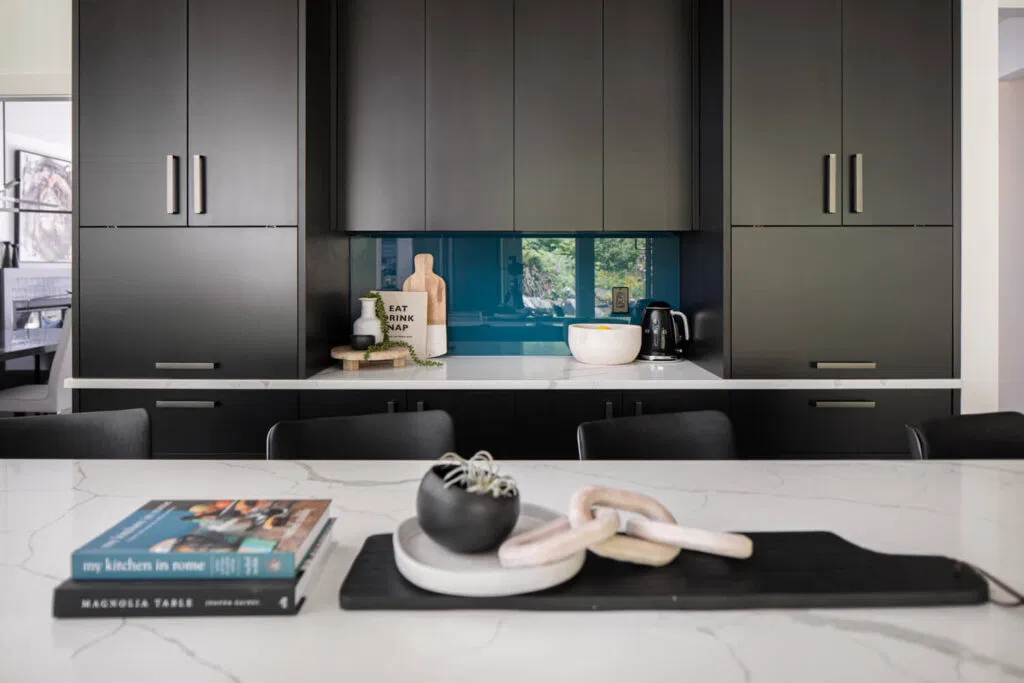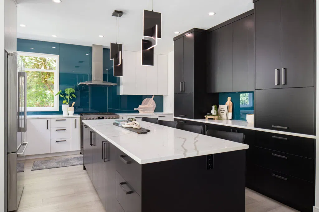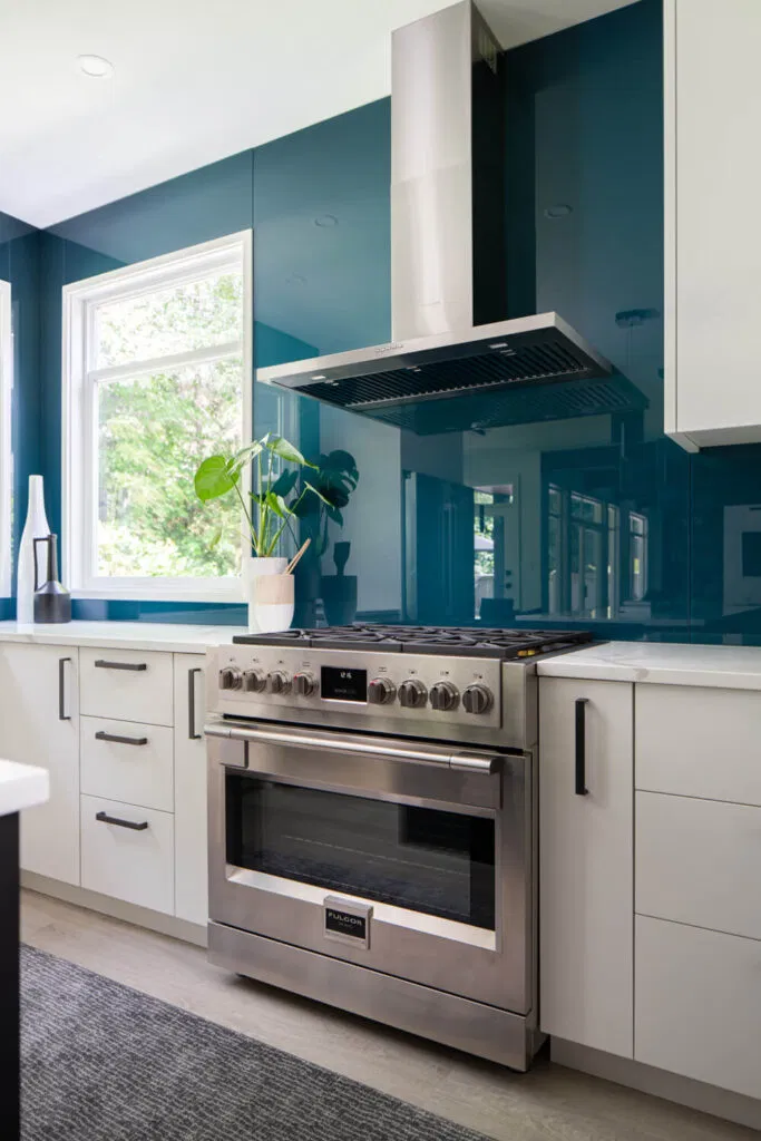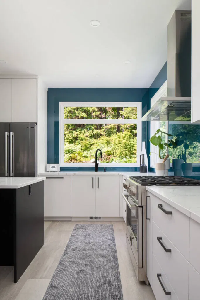For this North Vancouver renovation, NOVERO transformed a 1990s home to reflect the clients’ love of European modern design. The project included updates to the kitchen, living and family rooms, bathrooms, staircase, flooring, and front door. Clean lines, geometric forms, and a neutral palette of white, black, oak, and nickel create a calm, cohesive backdrop. A bold turquoise accent, starting at the front door and echoed throughout the home, adds a personal touch. Highlights include a sleek glass backsplash, thoughtful storage solutions in the kitchen, and a strong emphasis on simplicity, functionality, and timeless design throughout the space.