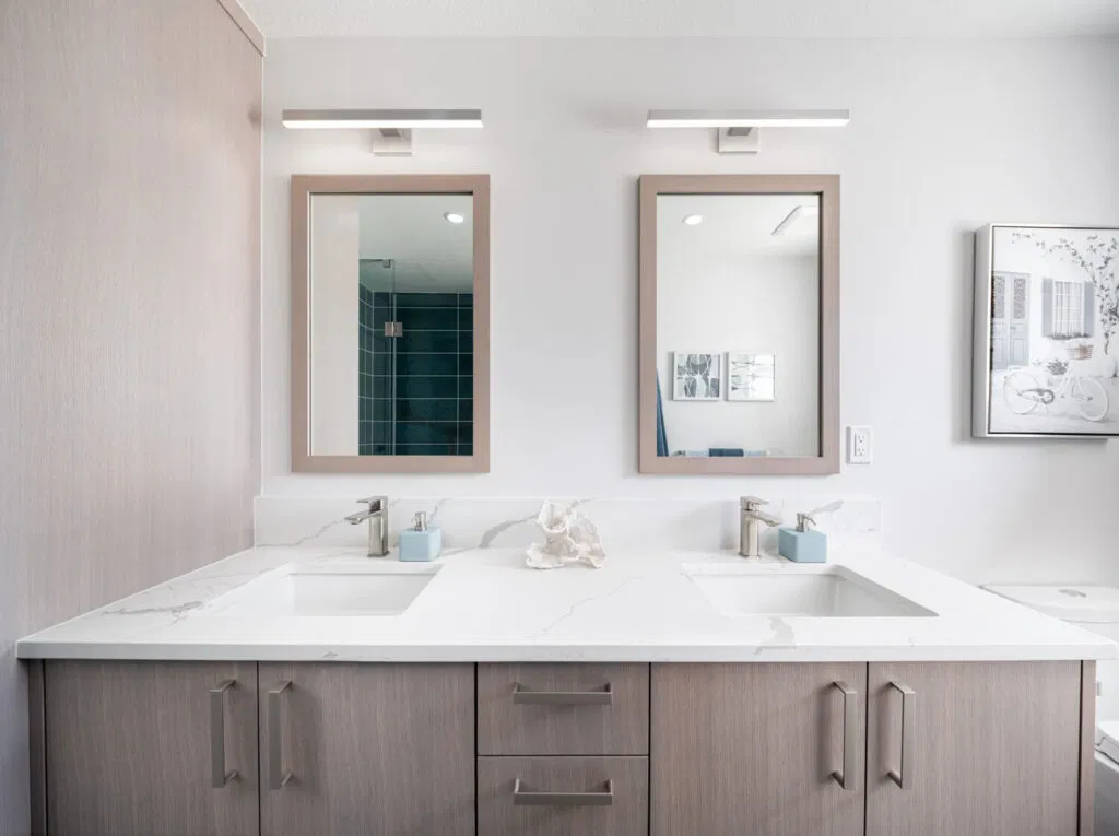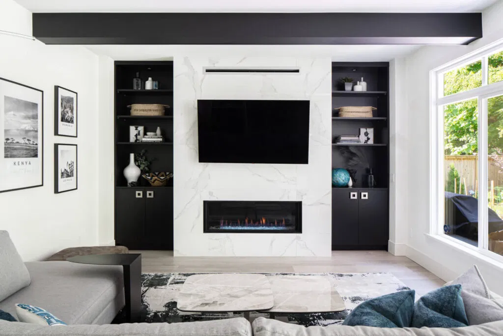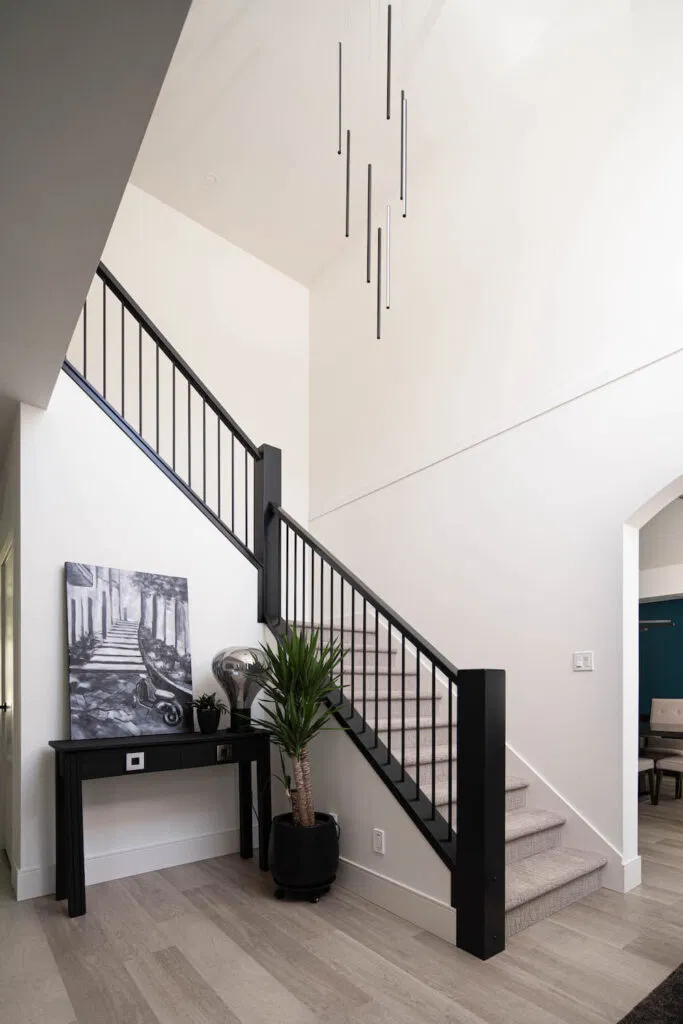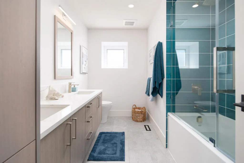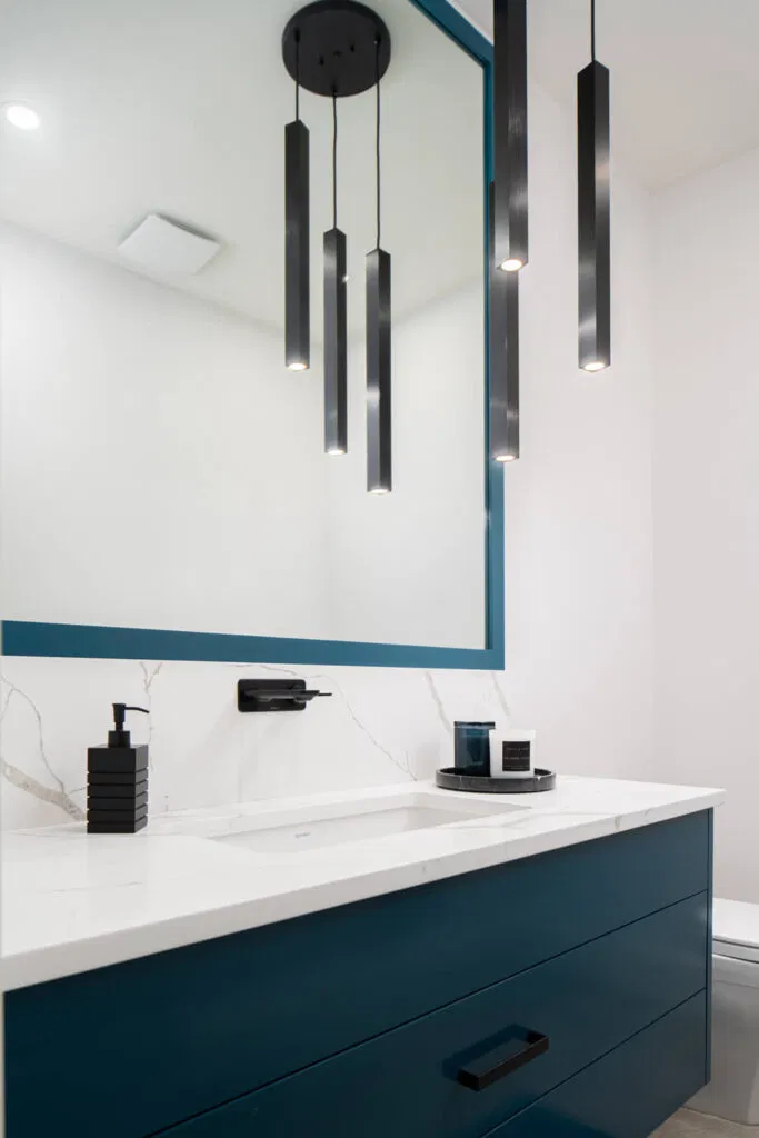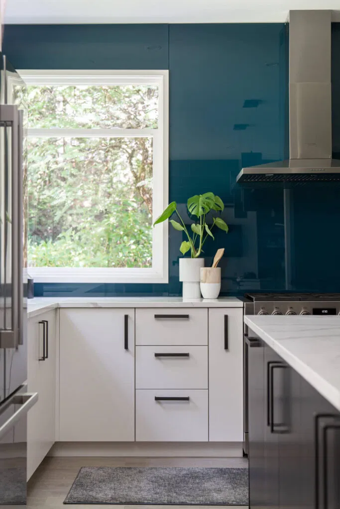 For this North Vancouver renovation, NOVERO transformed a 1990s home to reflect the clients’ love of European modern design. The project included updates to the kitchen, living and family rooms, bathrooms, staircase, flooring, and front door. Clean lines, geometric forms, and a neutral palette of white, black, oak, and nickel create a calm, cohesive backdrop. A bold turquoise accent, starting at the front door and echoed throughout the home, adds a personal touch. Highlights include a sleek glass backsplash, thoughtful storage solutions in the kitchen, and a strong emphasis on simplicity, functionality, and timeless design throughout the space.