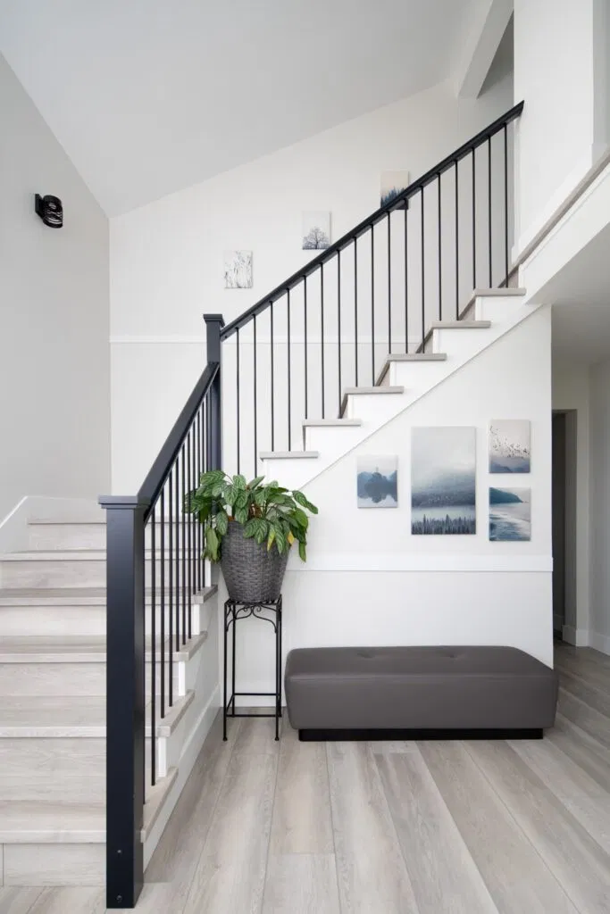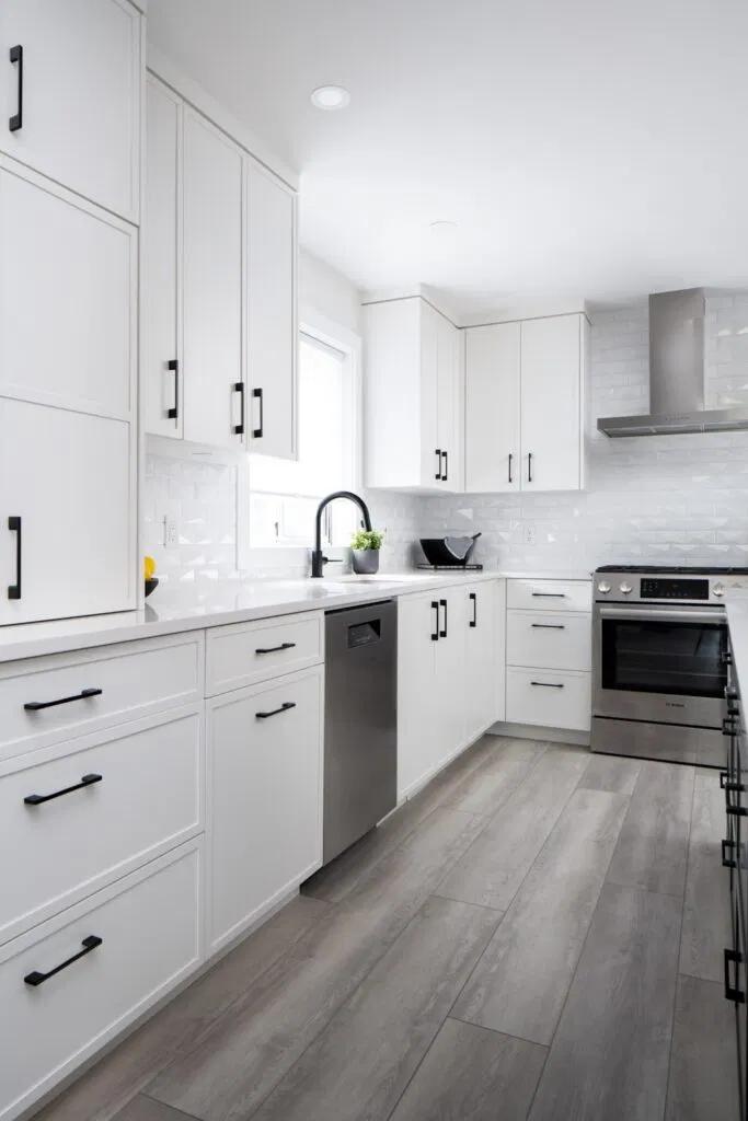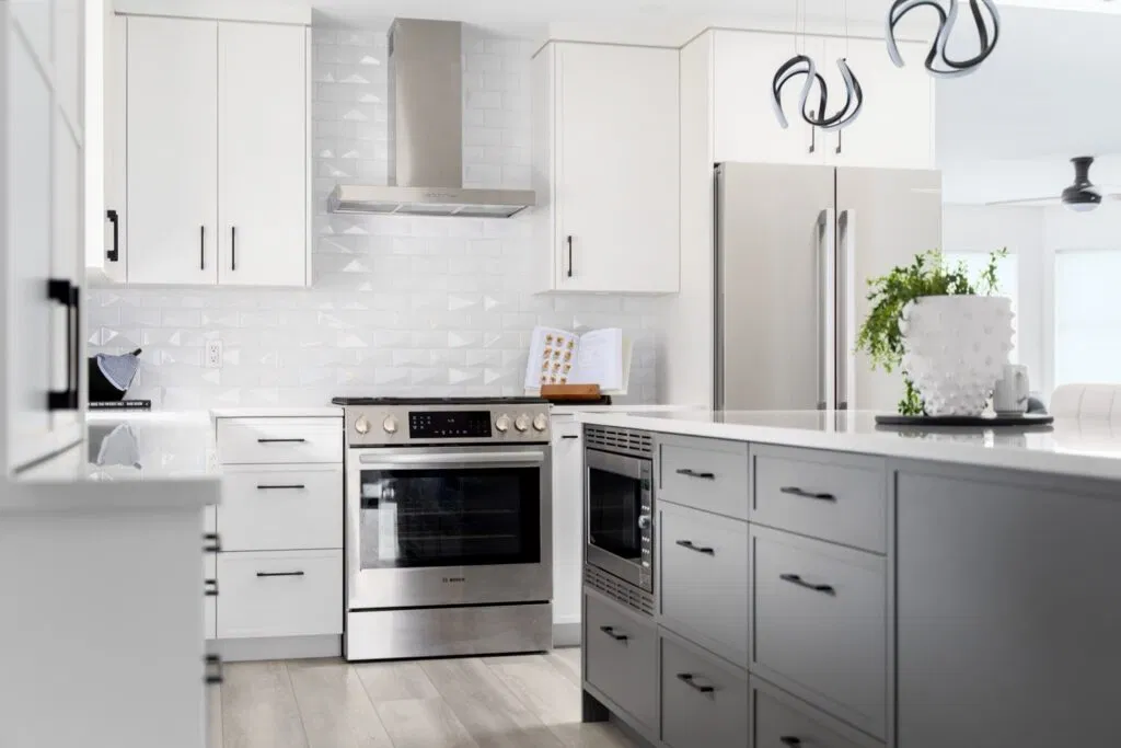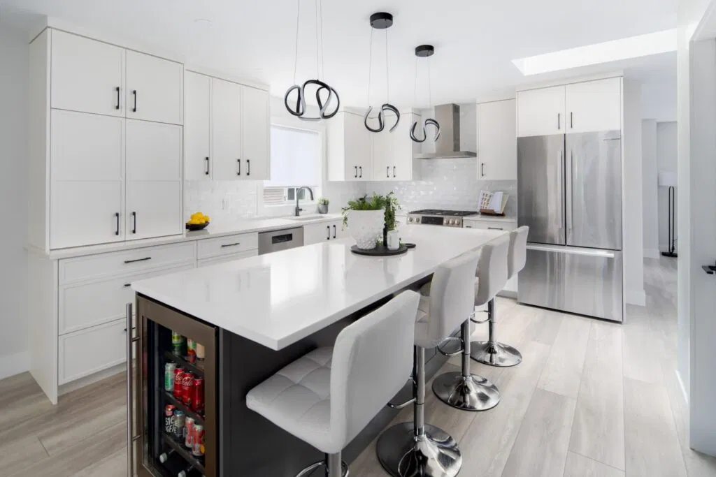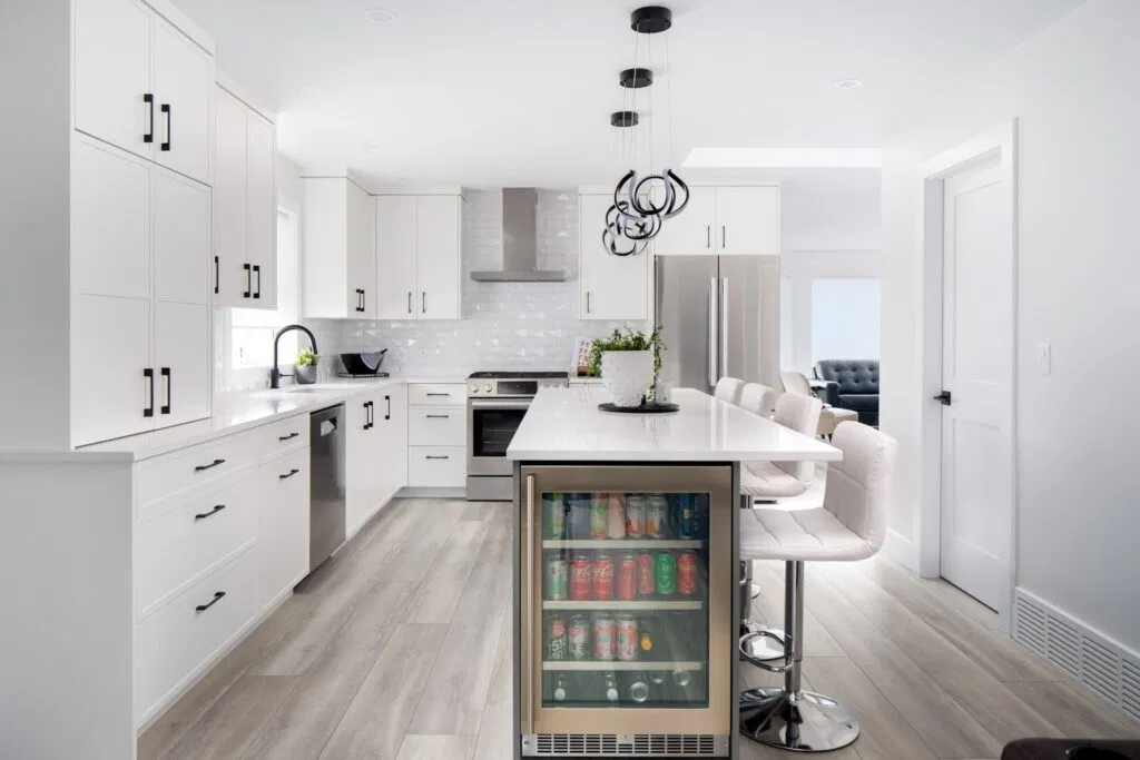 Multiple paint colours and flooring types made the original home feel choppy. A cohesive flow is achieved by installing luxury vinyl plank throughout the home (except bathrooms) and using a consistent colour scheme in a calming neutral palette. By removing a substantial living room fireplace wall, we create a spacious kitchen featuring a dining island and walk-in pantry. The kitchen - now a crisp white - features bright surfaces, modern fixtures, and a sophisticated dining environment. There’s plenty of room for entertaining and the homeowners are able to easily converse with guests in the adjoining family and living rooms.