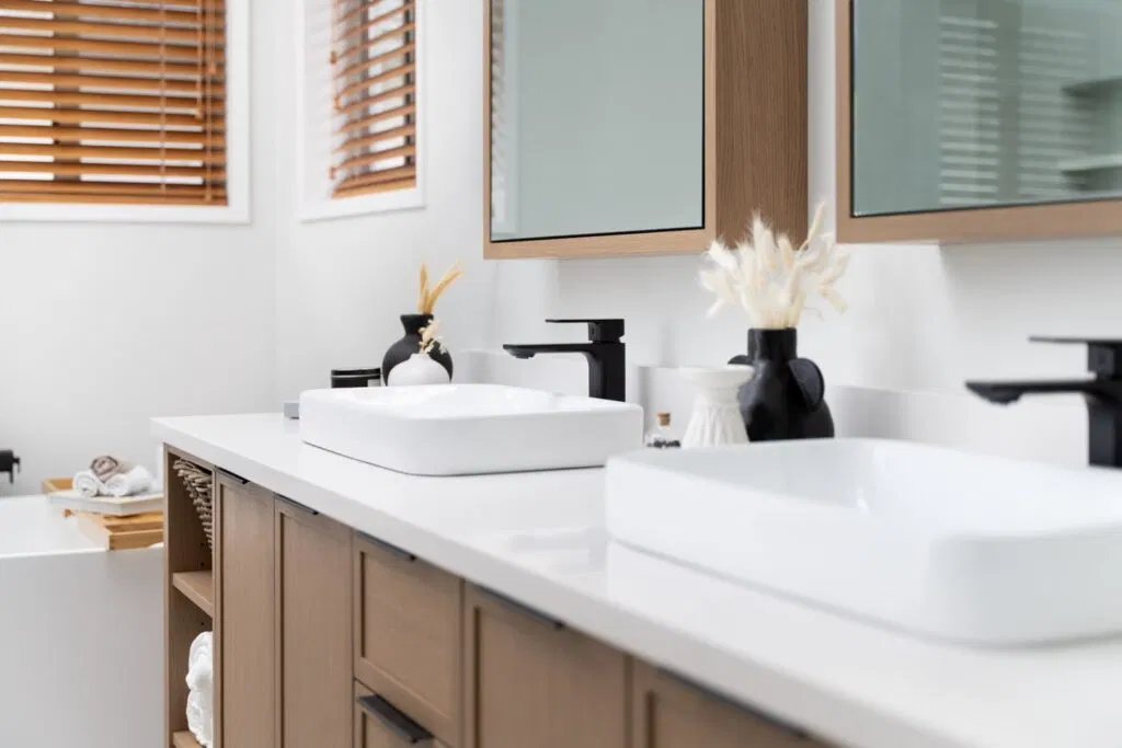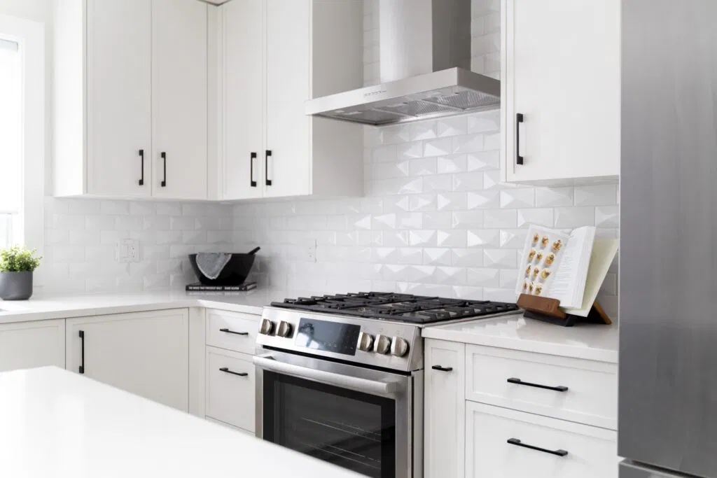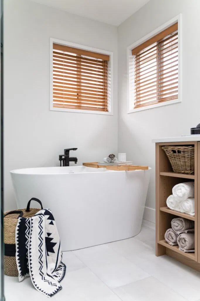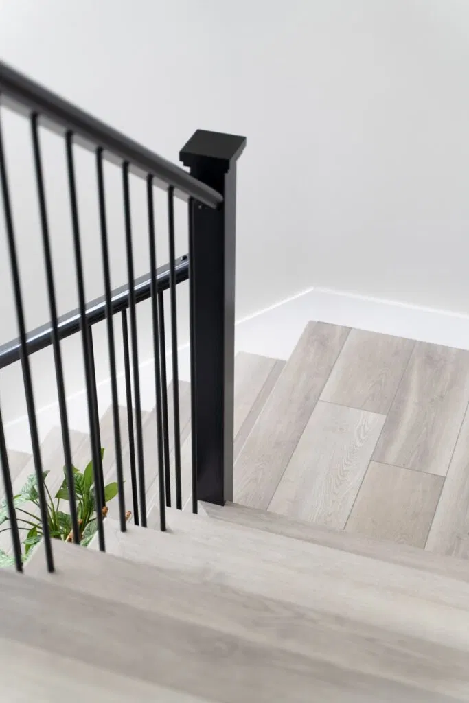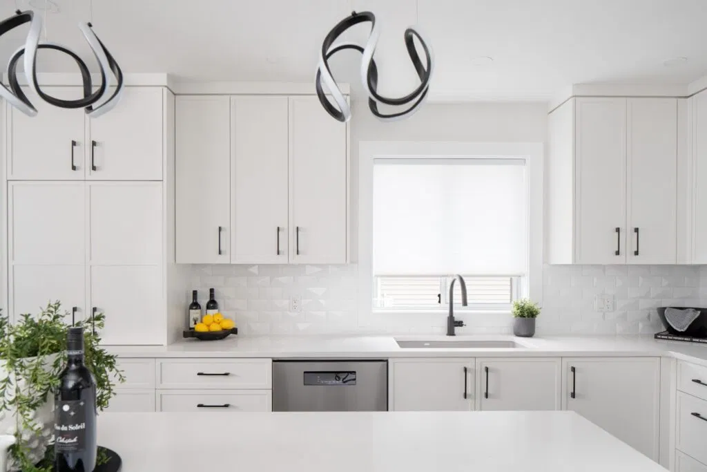 Multiple paint colours and flooring types made the original home feel choppy. A cohesive flow is achieved by installing luxury vinyl plank throughout the home (except bathrooms) and using a consistent colour scheme in a calming neutral palette. By removing a substantial living room fireplace wall, we create a spacious kitchen featuring a dining island and walk-in pantry. The kitchen - now a crisp white - features bright surfaces, modern fixtures, and a sophisticated dining environment. There’s plenty of room for entertaining and the homeowners are able to easily converse with guests in the adjoining family and living rooms.
