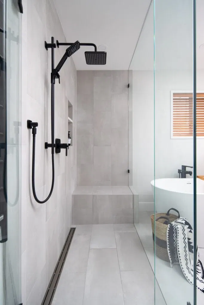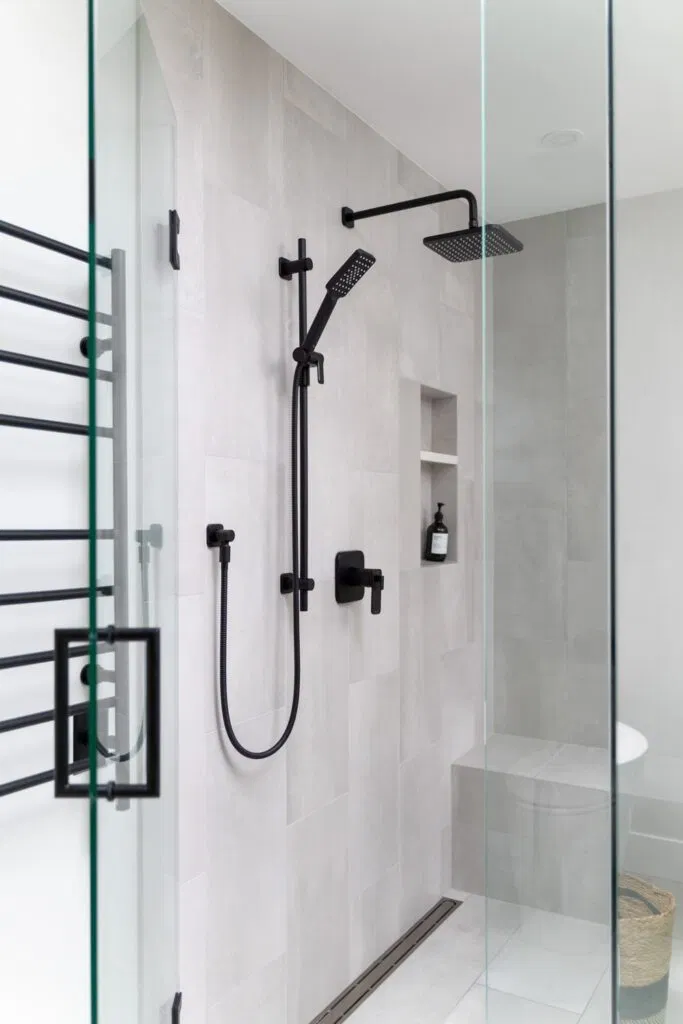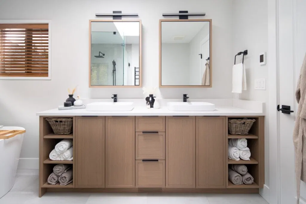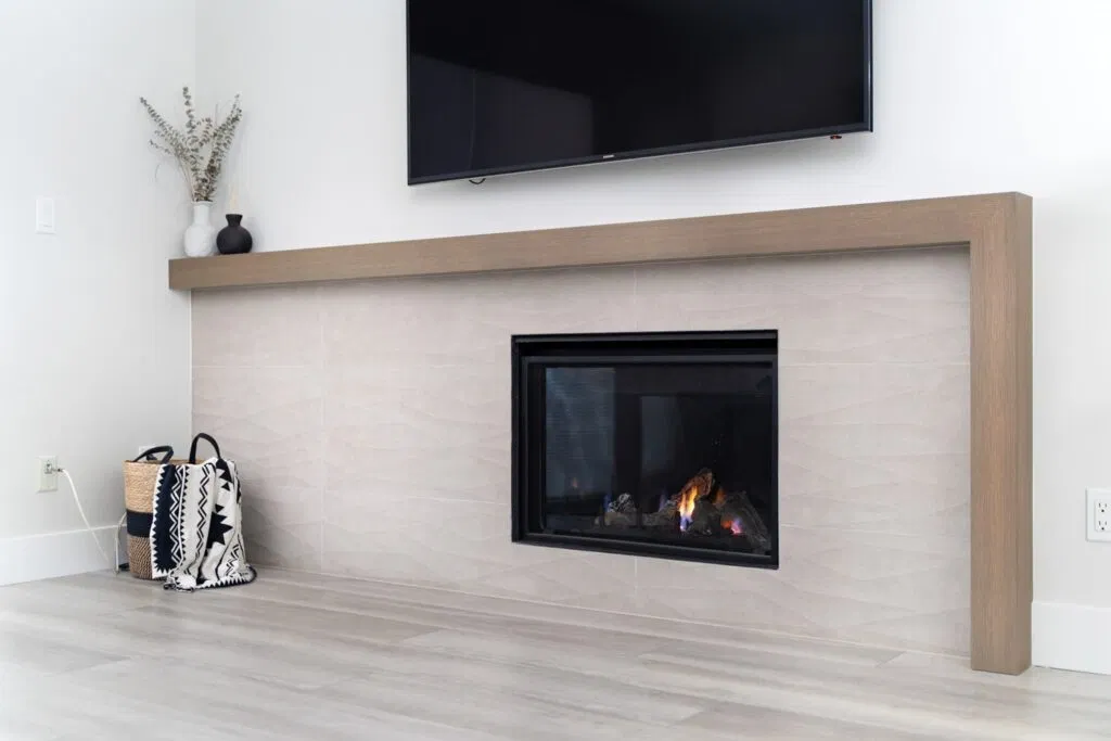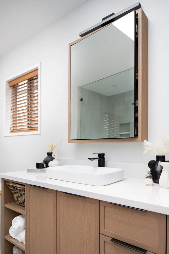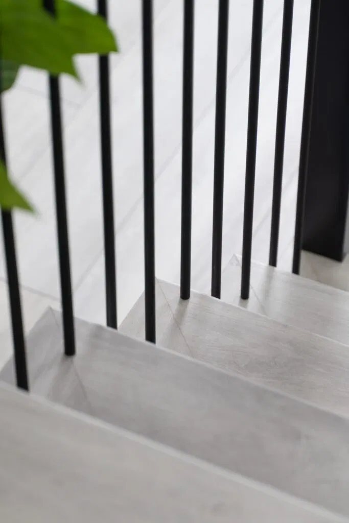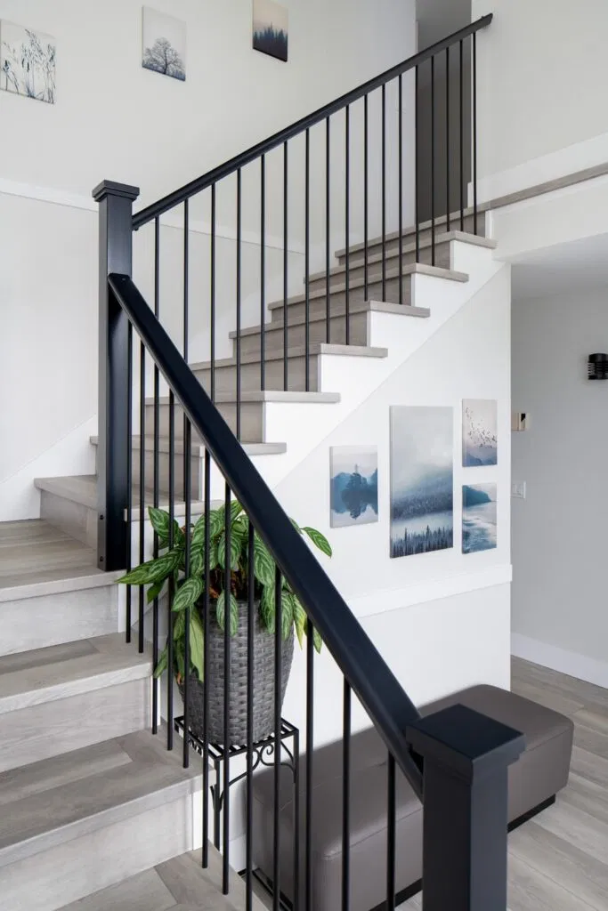 We updated the remaining fireplace to gas, adding an asymmetrical surround of oversized 16x48 earthy tiles and a stained oak mantel. The spa bathroom is realized through a natural palette, warm textures, walk-in shower, and elegant fixtures. Custom medicine cabinets and a matching oak vanity hide bathroom clutter. Finally, the staircase is modernized with a new black balustrade. The streamlined metal spindles and flat handrail contrast with the light grey floors, making a striking statement in the home’s entry.