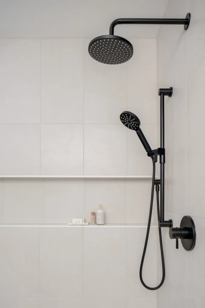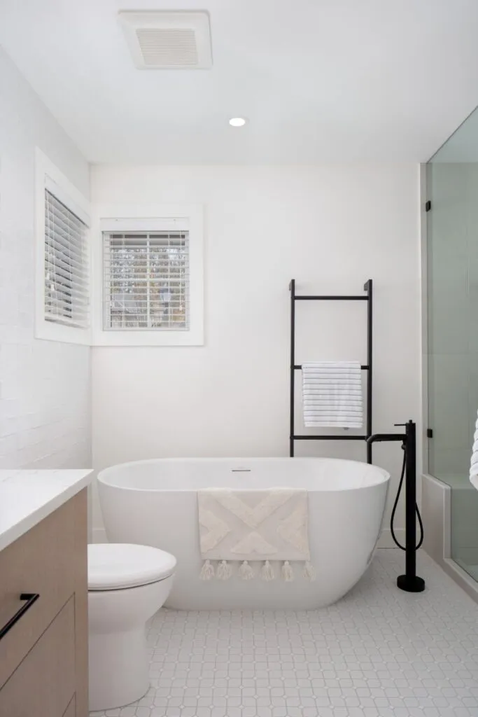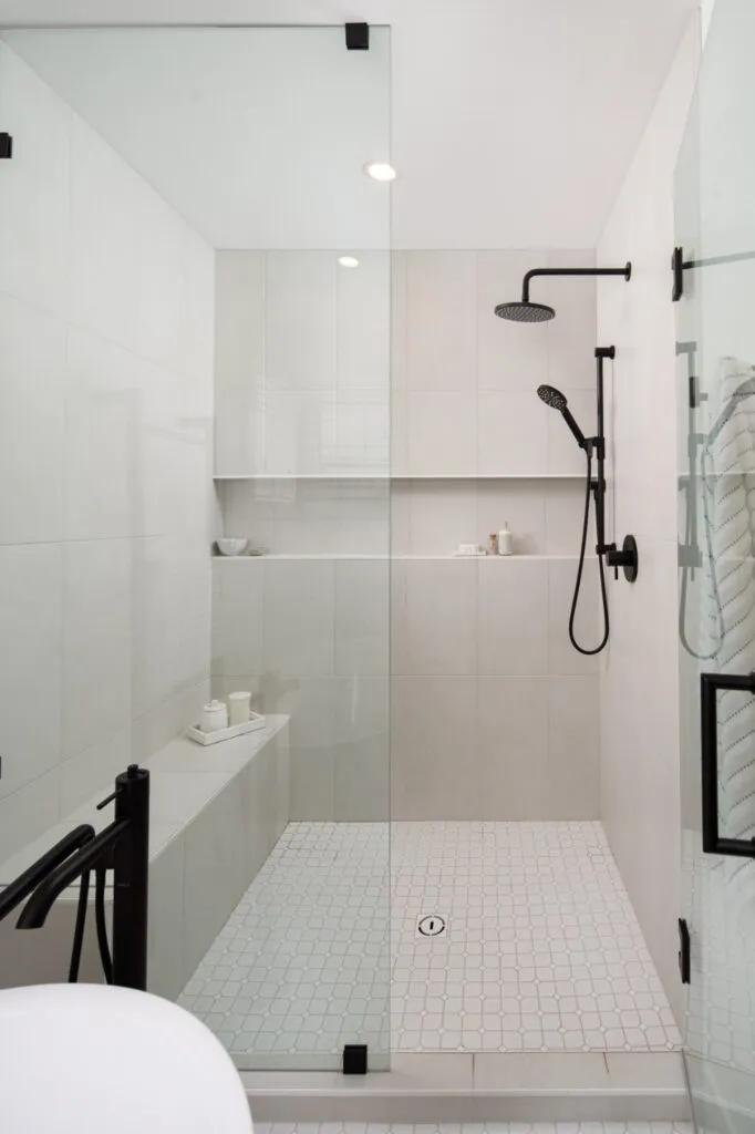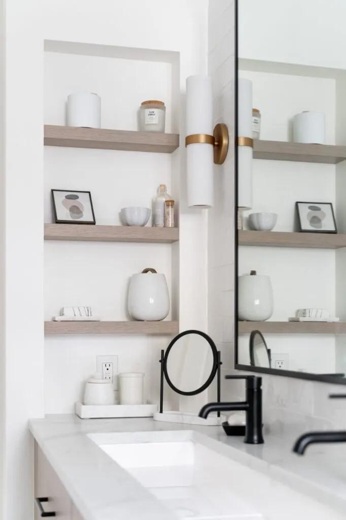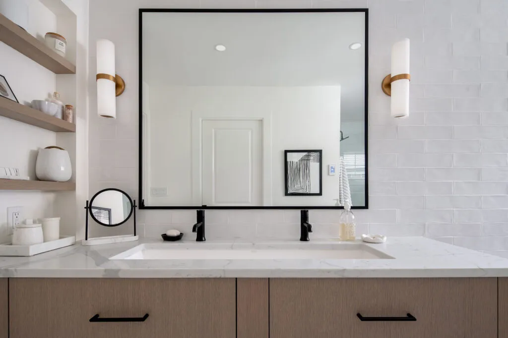 Light oak cabinetry and white surfaces keep the ensuite bath bright, while the contrasting black matte hardware and fixtures bring it to life. We included lots of texture and dimension by incorporating different materials such as polished quartz countertops, matte patterned floor tiles, and glossy wall tiles with an imperfect handmade appearance. Details like the open wood shelves in the wall niche, the full-width shower niche, custom black-framed mirror, and pop of brass on the wall sconces add interest. The larger walk-in shower was accommodated by capturing part of a closet on the other side of the wall.
