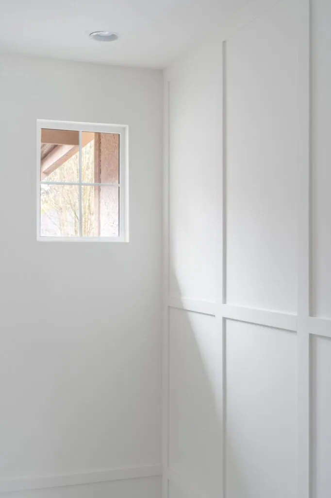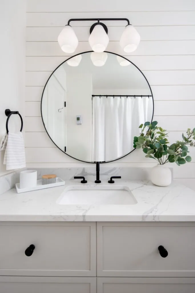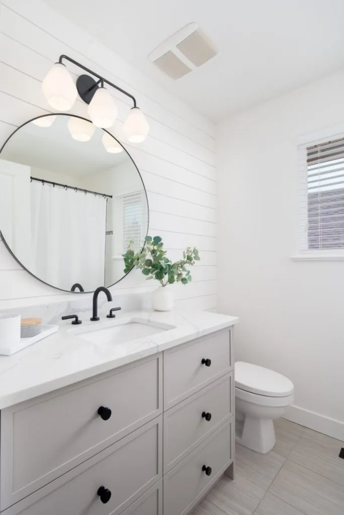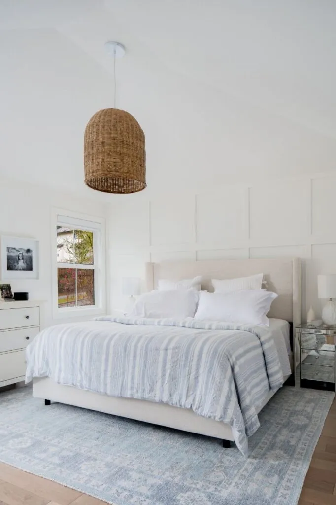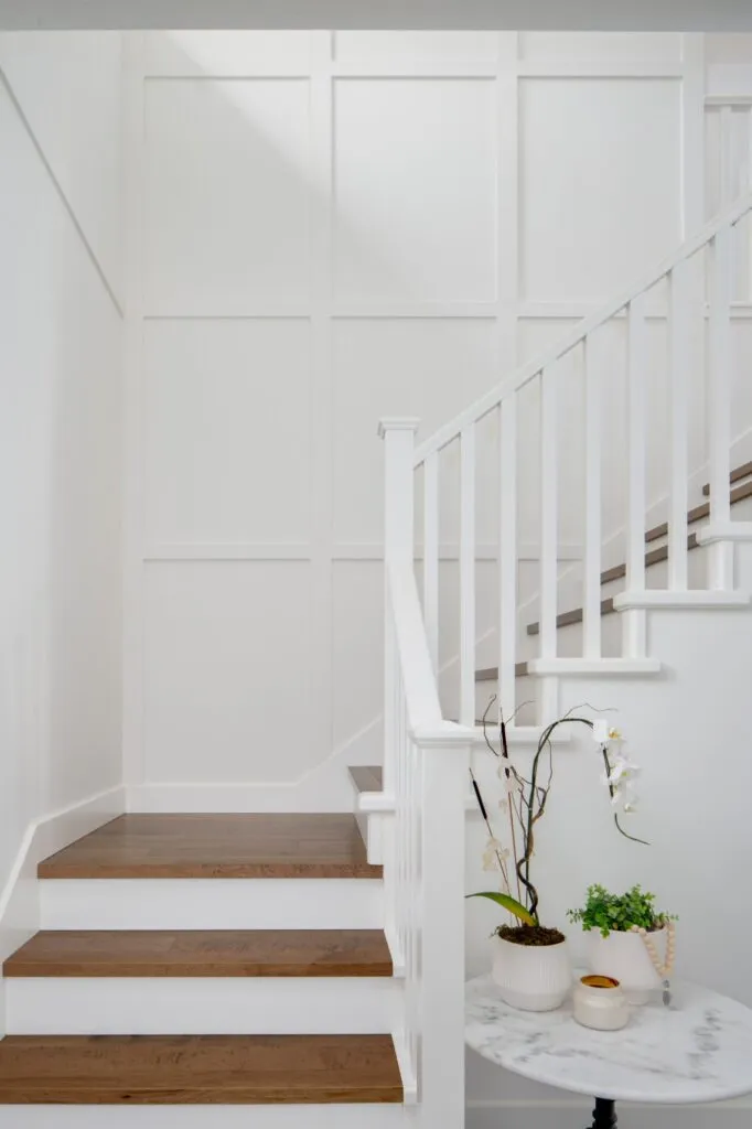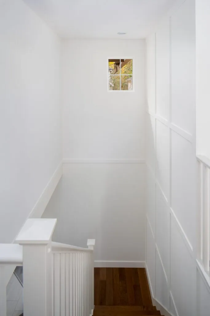 The kids' bathroom gives off a more casual, cottage vibe with soft grey cabinetry and a shiplap wall treatment. Board and batten wall panels in the stairwell and in the main bedroom inject interest to large expanses of wall. Adding an oversized rattan pendant from the lofted bedroom ceiling keeps the look laid-back. Finally, installing maple wood engineered floors on the upper floor and stair treads ties in with the main floor, increasing the warmth of this modern oasis.