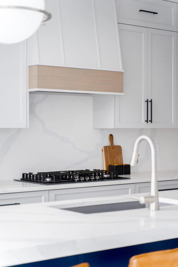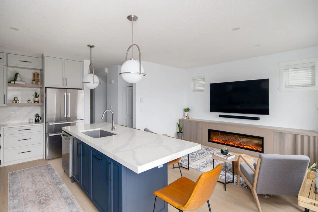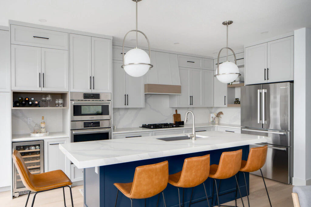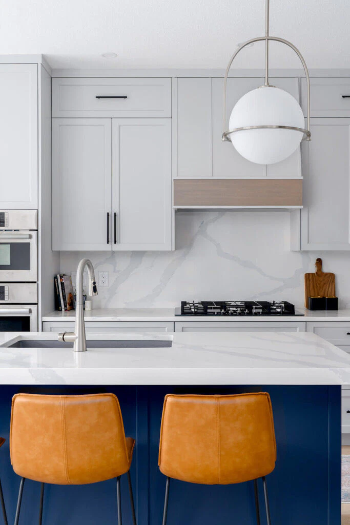 In this Coquitlam project, NOVERO Homes was tasked with elevating a builder-grade kitchen and family room. The result is an elegant yet functional Scandinavian-inspired space. The open concept features a light-hued kitchen with a hit of colour, overlooking an inviting sitting room. Light grey paint on the cabinets lend a sophisticated air to the kitchen. This classic neutral is not quite as stark as white, but blends beautifully with the veined quartz countertops and slab backsplash—the light hues maximizing the available natural light.