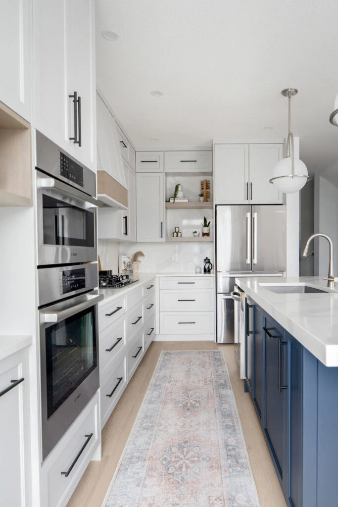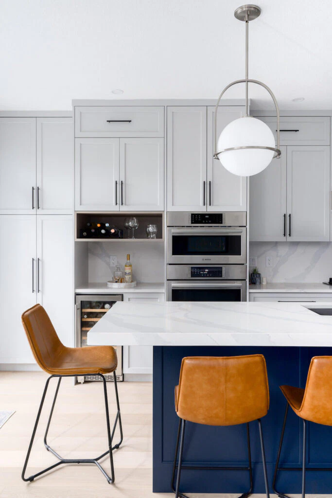 Mixing in contemporary design materials such as the rift-cut oak features, sleek continuous quartz surfaces, matte black hardware, and oversized pendant lighting, adds the right amount of interest to the space.