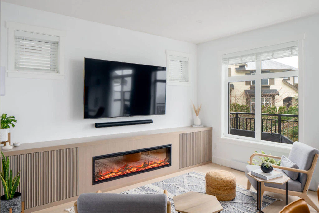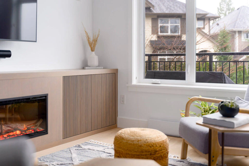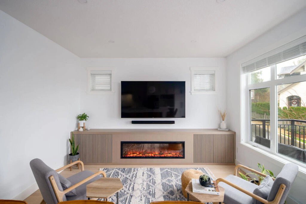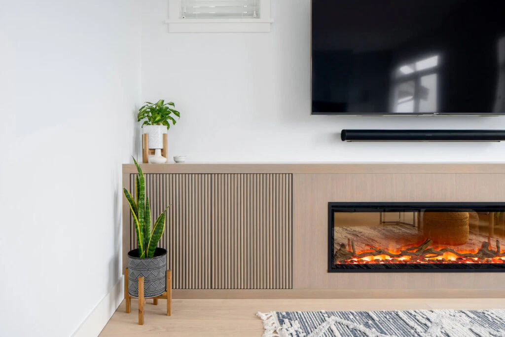Rich wood textures throughout add warmth and keep the look unified. All the wood features, from the open shelves and hood fan trim in the kitchen, to the engineered wood flooring and custom-built media cabinet, are oak stained in cohesive tones. The millwork in the family room anchors the space, framing a 60” wide linear electric fireplace and neatly storing equipment and games behind reeded wood touch-latch doors.