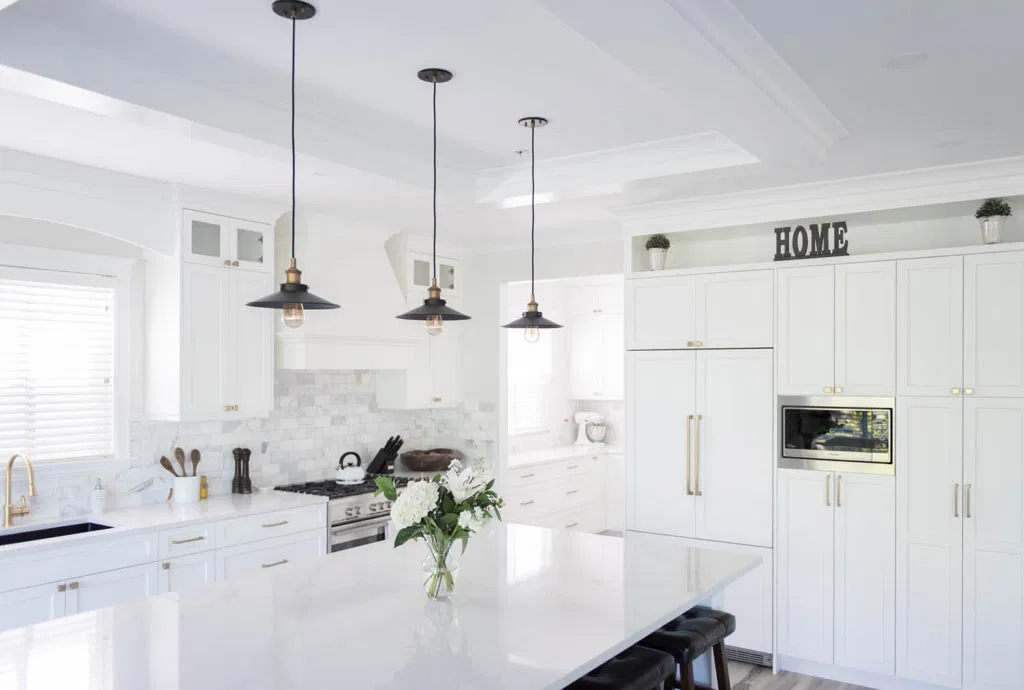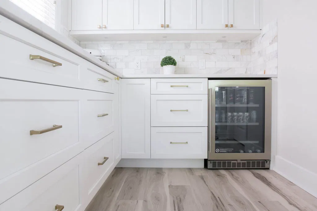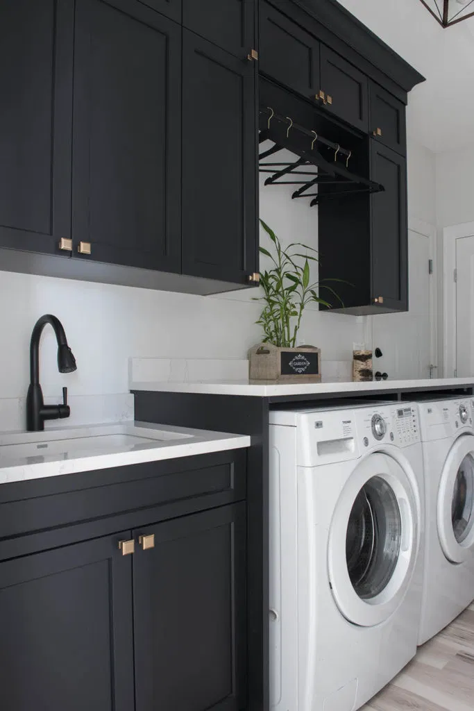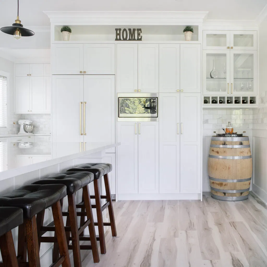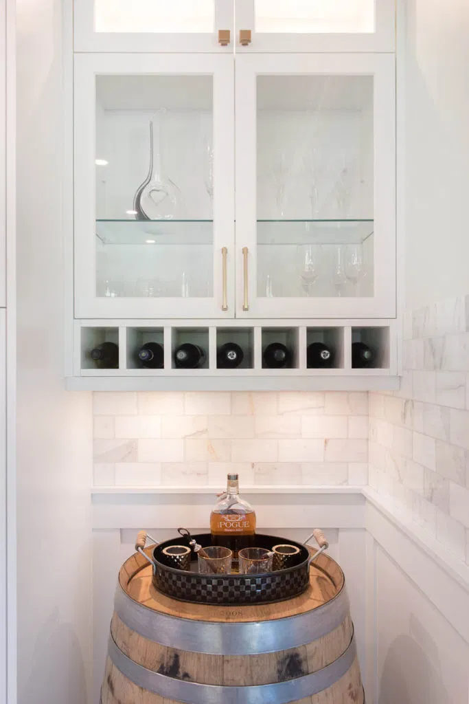 Second, we renovated the kitchen and laundry. Our client had a focussed vision based on extensive research. NOVERO executed her vision for the detailed undermount hood fan, arch over the kitchen sink, upper glass cabinets with pot lights, and drop ceiling with crown moulding. Other details include Calacatta marble subway tile as the backsplash, Eternal Calacatta Gold polished silestone counters, and elegant millwork on the island. Unique highlights include the bar featuring a wine barrel and glass cabinets to display glassware; and the butler pantry extension. All these elements truly evaluate the heart of their home to showpiece status. But we can’t forget the laundry room! We love the black dramatic look that our client chose, a high-impact contrast to the lightness of the kitchen.