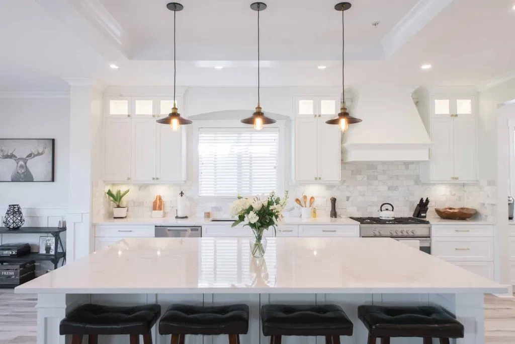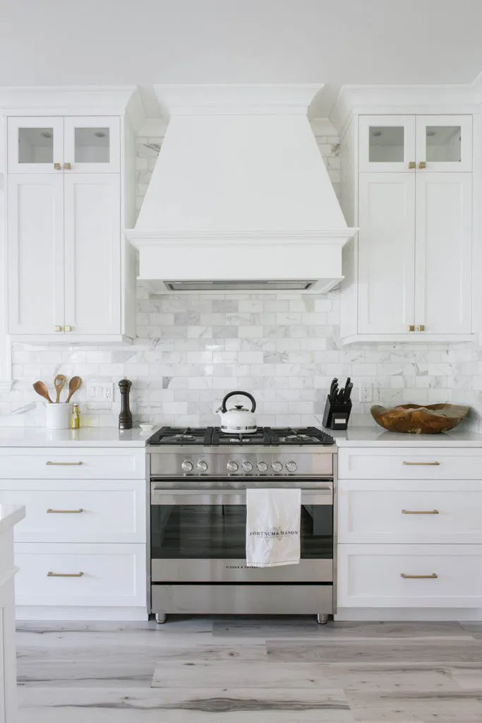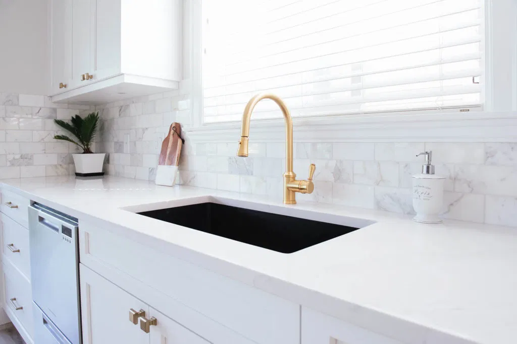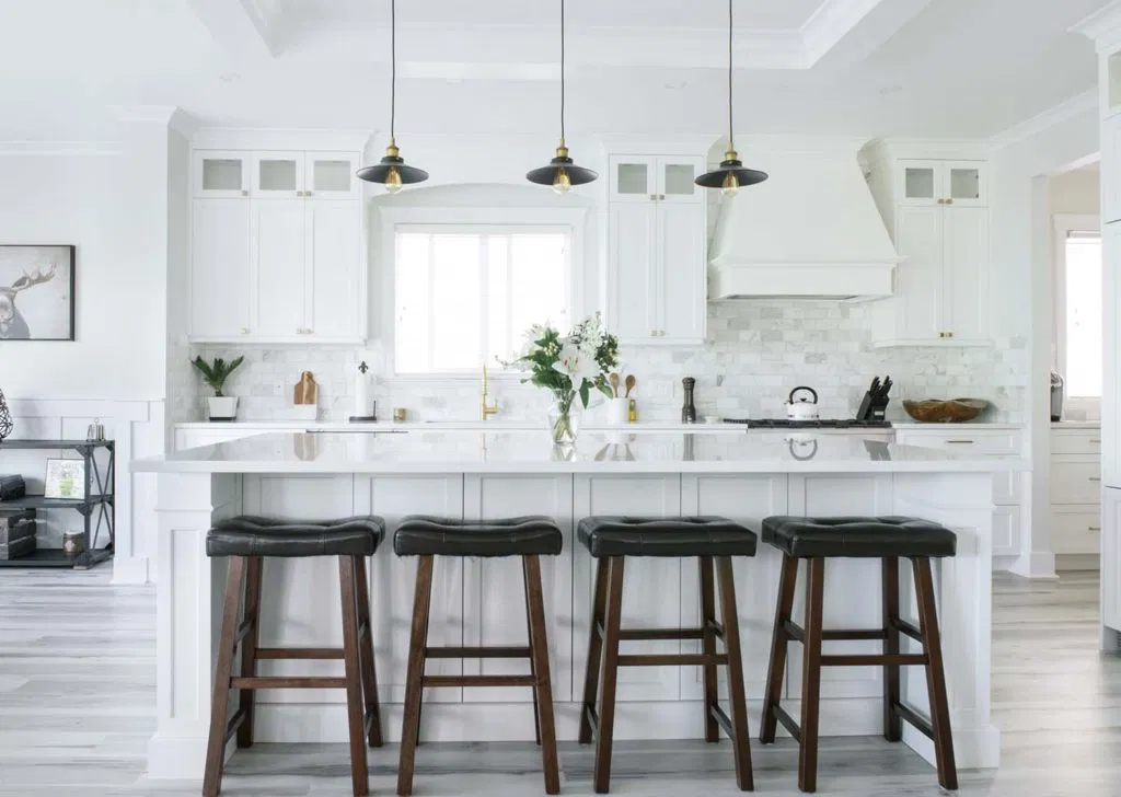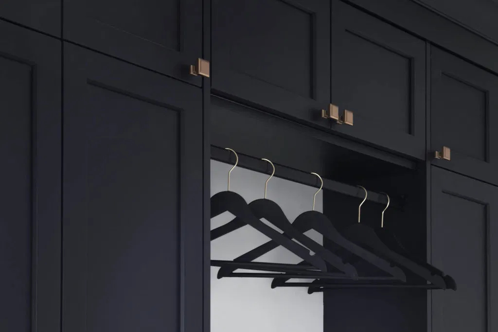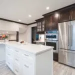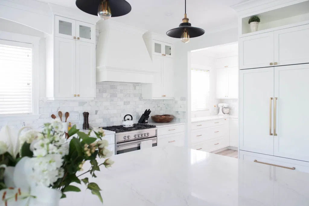 Second, we renovated the kitchen and laundry. Our client had a focussed vision based on extensive research. NOVERO executed her vision for the detailed undermount hood fan, arch over the kitchen sink, upper glass cabinets with pot lights, and drop ceiling with crown moulding. Other details include Calacatta marble subway tile as the backsplash, Eternal Calacatta Gold polished silestone counters, and elegant millwork on the island. Unique highlights include the bar featuring a wine barrel and glass cabinets to display glassware; and the butler pantry extension. All these elements truly evaluate the heart of their home to showpiece status. But we can’t forget the laundry room! We love the black dramatic look that our client chose, a high-impact contrast to the lightness of the kitchen.